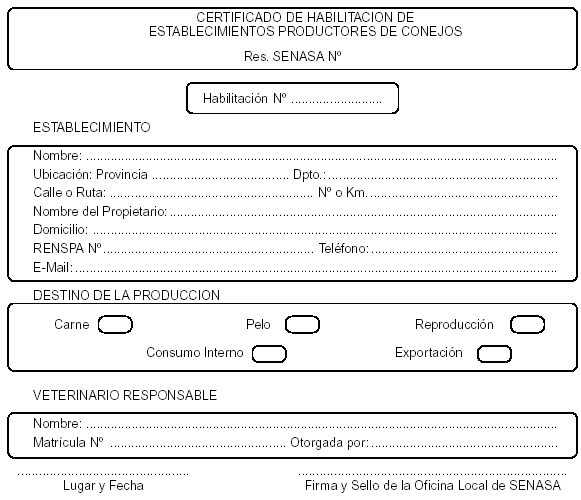 Art. 4º — El propietario o responsable de cada uno de los establecimientos de producción cunícola que se detallan en el artículo 1º de la presente resolución, deberá solicitar en la Oficina Local del SENASA correspondiente a la zona en que se encuentra el establecimiento, la habilitación del mismo, para lo cual se procederá como a continuación se detalla: a) Solicitud de Habilitación en la Oficina Local. b) Inspección del establecimiento por personal autorizado del SENASA. c) Extensión de un "Certificado de Habilitación" por parte de la Oficina Local correspondiente, de acuerdo al modelo que se detalla en el Anexo que forma parte integrante de la presente resolución. El Certificado que se menciona, se realizará por duplicado entregándose UN (1) original al interesado y quedando UNA (1) copia para su archivo en la Oficina Local. Art. 5º — El Servicio de Inspección Veterinaria de la Dirección Nacional de Fiscalización Agroalimentaria autorizará la faena de conejos, cuando los mismos provengan de granjas habilitadas por la Dirección Nacional de Sanidad Animal y su número de habilitación conste en el Certificado de Tránsito correspondiente. Art. 6º — Créase en el ámbito de la Dirección Nacional de Sanidad Animal, el "Registro Nacional de Establecimientos Habilitados para Productores de Conejos". Art. 7º — Las Oficinas Locales del SERVICIO NACIONAL DE SANIDAD Y CALIDAD AGROALIMENTARIA confeccionarán UN (1) listado de los establecimientos productores de conejos que fueran habilitados, correspondientes a cada Partido o Departamento, y deberán informar y actualizar en forma permanente a la Dirección Nacional de Sanidad Animal a fin de que los mismos sean incorporados en el Registro Nacional mencionado en el artículo precedente. Art. 8º — Invítase a los Gobiernos Provinciales y Municipales a considerar los contenidos, requisitos y exigencias de la presente norma, para el otorgamiento de habilitaciones a establecimientos cunícolas de producción, en todos los ámbitos de su Jurisdicción. Art. 9º — Los establecimientos cunícolas que se enumeran en el artículo 1º y se encuentren instalados con anterioridad a la presente norma, deberán adecuarse a fin de cumplir con las exigencias de la misma. Art. 10. — El traslado de conejos vivos con destino a faena u otro destino, deberá ser amparado y acompañado por el Documento para el Tránsito de Animales (DTA) que emite el SENASA desde sus Oficinas Locales, de manera que una vez concluido el período de crianza y engorde, y antes de realizar el traslado de los conejos a la faena, cada productor o responsable del establecimiento deberá solicitar este documento en la Oficina Local del SENASA más próxima. Art. 11. — El transportista del camión o vehículo que traslade conejos vivos a faena o a otro destino deberá exhibir el Documento para el Tránsito de Animales (DTA) correspondiente a esa carga, cada vez que se lo requiera el personal del SENASA u otras autoridades nacionales o provinciales, apostadas en las rutas. Art. 12. — Los conejos deberán estar identificados para su traslado, mediante algún sistema (Nº en las jaulas, nombre del establecimiento u otro) que permita identificar el establecimiento del cual provienen y esa información deberá estar detallada en el Documento para el Tránsito de Animales (DTA) que acompañe a su transporte. Si en un mismo camión se trasladaran conejos provenientes de más de UN (1) establecimiento, deberán estar acompañados de los Documentos para el Tránsito de Animales (DTA) correspondientes a cada uno de los establecimientos y dotados de sus respectivas identificaciones. Art. 13. — Autorízase a la Dirección Nacional de Sanidad Animal a modificar o dictar normas complementarias a la presente resolución, a efectos de actualizar, complementar y adecuar la aplicación e implementación de la misma. Art. 14. — Comuníquese, publíquese, dése a la Dirección Nacional del Registro Oficial y archívese. — Bernardo G. Cané.
