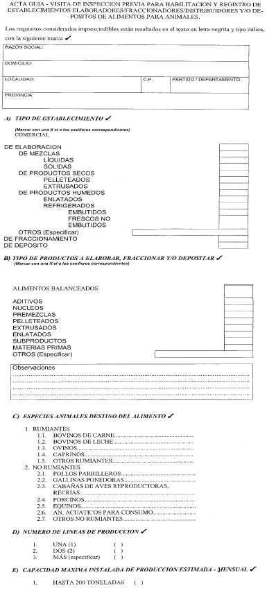 Apéndice 2 DOCUMENTACION REQUERIDA Las personas físicas o jurídicas interesadas deberán presentar la SOLICITUD DE HABILITACION Y REGISTRO, según modelo que consta como Apéndice 1 Capítulo II, conjuntamente con la documentación que se detalla, según corresponda: A. FIRMAS ELABORADORAS CON ESTABLECIMIENTO PROPIO: - Contrato social autenticado por escribano . - En el caso de tratarse de una empresa unipersonal, fotocopia autenticada de primera y segunda hoja del Documento Nacional de Identidad (D.N.I.) y de la Clave Unica de Identificación Tributaria (C.U.I.T.) . - En el caso de tratarse de sociedades de hecho, carta-compromiso de los integrantes, con fotocopias autenticadas de primera y segunda hoja del D.N.I. de cada uno de ellos y del C.U.I.T . - Fotocopia autenticada de la habilitación municipal acorde a la actividad a desarrollar . - Descripción del tipo de alimentos a elaborar . - Plano de ubicación, con sus vías de acceso escala UNO EN DOS MIL (1:2000), en el caso de tratarse de establecimientos rurales . - Copia del plano escala UNO EN CIEN (1:100) aprobado por Municipalidad, según corresponda . - Esquema coincidente con el plano indicando dependencias, equipos fijos e instalaciones . - Memoria descriptiva física-edilicia . - Flujograma operativo . - Protocolo de análisis de agua, físico químico y bacteriológico, realizado por Organismo Oficial competente, según corresponda . - Declarar si los controles de calidad de los productos se efectuarán en laboratorio propio y/o de terceros . - Declarar si además de elaborar alimentos, en el establecimiento se realiza otra actividad (detallar) . - Carta presentación del profesional a cargo de la Responsabilidad Técnica . - Fotocopia reducida y autenticada del título profesional del responsable técnico y certificado de vigencia de la habilitación profesional, librado por la autoridad emisora de la misma (Matrícula) . B. FIRMAS QUE ELABORAN EN ESTABLECIMIENTOS DE TERCEROS HABILITADOS: - Contrato social autenticado por escribano . - En el caso de tratarse de una empresa unipersonal, fotocopia autenticada de primera y segunda hojas del D.N.I. y del C.U.I.T . - En el caso de tratarse de sociedades de hecho, carta-compromiso de los integrantes, con fotocopias autenticadas de primera y segunda hoja del D.N.I. de cada uno de ellos y del C.U.I.T . - En el caso de tratarse de empresas unipersonales y sociedades de hecho deberán presentar certificación legal del domicilio emitida por autoridad competente . - Fotocopia de la habilitación otorgada por el SENASA a la firma elaboradora, para la elaboración de productos destinados a la alimentación animal . - Carta del Elaborador declarando que acepta elaborar para el tercero solicitante . - Declarar si los controles de calidad de los productos se efectuarán en laboratorio propio y/o de terceros . - Carta presentación del profesional a cargo de la Responsabilidad Técnica . - Fotocopia reducida y autenticada del título profesional del responsable técnico y certificado de vigencia de la habilitación profesional, librado por la autoridad emisora de la misma (Matrícula) . C. FIRMAS DISTRIBUIDORAS, IMPORTADORAS Y EXPORTADORAS CON DEPOSITO PROPIO . - Contrato social autenticado por escribano . - En el caso de tratarse de una empresa unipersonal, fotocopia autenticada de primera y segunda hoja del D.N.I. y del C.U.I.T . - En el caso de tratarse de sociedades de hecho, carta-compromiso de los integrantes, con fotocopias autenticadas de primera y segunda hoja del D.N.I. de cada uno de ellos y del C.U.I.T . - Fotocopia autenticada de la habilitación municipal acorde a la actividad a desarrollar . Si el depósito es alquilado deberá presentar el contrato de locación . - Descripción del tipo de alimentos a depositar . - Copia del plano en escala UNO EN CIEN (1:100) aprobado por Municipalidad . - Memoria descriptiva física-edilicia . - Protocolo de análisis de agua, físico químico y bacteriológico, realizado por Organismo Oficial competente, según corresponda . - Declarar si además de depositar alimentos, en el establecimiento se realiza otra actividad (detallar) - Carta presentación del profesional a cargo de la Responsabilidad Técnica . - Fotocopia reducida y autenticada del título profesional del responsable técnico y certificado de vigencia de la habilitación profesional, librado por la autoridad emisora de la misma (Matrícula) . D. FIRMAS DISTRIBUIDORAS, IMPORTADORAS Y EXPORTADORAS CON DEPOSITO EN TERCEROS . - Contrato social autenticado por escribano . - En el caso de tratarse de una empresa unipersonal, fotocopia autenticada de primera y segunda hoja del D.N.I. y del C.U.I.T . - En el caso de tratarse de sociedades de hecho, carta-compromiso de los integrantes, con fotocopias autenticadas de primera y segunda hoja del D.N.I. de cada uno de ellos y del C.U.I.T . - En el caso de tratarse de empresas unipersonales y sociedades de hecho deberán presentar certificación legal del domicilio emitida por autoridad competente . - Fotocopia de la habilitación otorgada por este Organismo a la firma titular del depósito para productos destinados a la alimentación animal . - Carta del responsable del depósito declarando que acepta depositar . - Carta presentación del profesional a cargo de la Responsabilidad Técnica . - Fotocopia reducida y autenticada del título profesional del responsable técnico y certificado de vigencia de la habilitación profesional, librado por la autoridad emisora de la misma (Matrícula) . E. AUTOELABORADORES . - Contrato social autenticado por escribano . - En el caso de tratarse de una empresa unipersonal, fotocopia autenticada de primera y segunda hoja del D.N.I. y del C.U.I.T . - En el caso de tratarse de sociedades de hecho, carta-compromiso de los integrantes, con fotocopias autenticadas de primera y segunda hoja del D.N.I. de cada uno de ellos y del C.U.I.T . - Fotocopia autenticada de la habilitación municipal acorde a la act