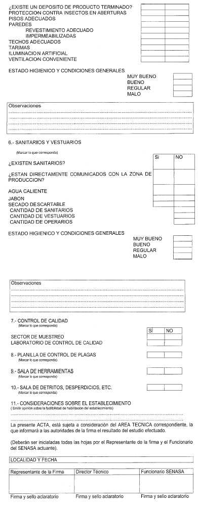 CAPITULO IV - DE LAS CONDICIONES HIGIENICO-SANITARIAS 1. El establecimiento y/o los equipos de elaboración deberán ser mantenidos en perfectas condiciones higiénico-sanitarias, debiéndose velar por su conservación al comenzar y finalizar la labor diaria . 2. Se deberá implementar un plan que asegure el efectivo control de plagas con sistemas de registros auditables . 3. Se deberá contar en cada uno de los sectores de producción con temperatura y humedad adecuadas evitando la formación y propagación de mohos y toxinas . 4. Al finalizar la labor diaria, las maquinarias y equipos utilizados deberán someterse a un proceso de limpieza, evitando de esta manera la contaminación cruzada . 5. La indumentaria utilizada por los operarios en el área de producción deberá estar limpia y reunir las condiciones que permitan asegurar la no-contaminación del producto final. Luego de su uso deberán ser higienizadas. La indumentaria de todo el personal que ingrese el área de producción deberá reunir iguales condiciones y se deberá mantener una adecuada higiene personal . 6. No debe ser permitido fumar, beber, comer, o mantener alimentos, bebidas, cigarrillos y medicamentos personales en las áreas de elaboración, de laboratorio de control de calidad y de almacenamiento, o en cualquier otra área en que tales acciones puedan influir adversamente en la calidad del producto . CAPITULO V - DE LA RESPONSABILIDAD TECNICA Consideraciones generales: 1. Las personas físicas o jurídicas inscriptas en el Servicio en algunos de los siguientes rubros: elaborador, fraccionador, depósito, distribuidor, importador o exportador de productos destinados a la alimentación animal en establecimiento propio o de terceros habilitados, deben contar con un responsable técnico universitario, graduado en las siguientes carreras: a) Productos destinados a animales de compañía, ornamentales, exóticos, u otros que involucren la salud animal: Médico Veterinario . b) Otros productos para la alimentación animal: Médico Veterinario o Ingeniero Agrónomo . Para que la Responsabilidad Técnica pueda ser ejercida por un profesional universitario de carreras afines a las enunciadas precedentemente, se deberá solicitar autorización previa a la iniciación del trámite, acompañando los antecedentes curriculares del profesional propuesto, incluyendo los contenidos de los estudios de grado cursados . 2. El responsable técnico de establecimiento y/o firma inscripta tiene la obligación de registrarse para esa función ante el Servicio. Para ello deberá presentar copia reducida de su título universitario debidamente autenticada, el certificado actualizado de la matrícula profesional expedida por la autoridad competente y nota de presentación, firmada por un representante de la firma . 3. Sin perjuicio de las otras causas de incompatibilidad que pudieran surgir del ordenamiento jurídico vigente, déjase establecido que la responsabilidad técnica de un establecimiento y/o firma es incompatible con el ejercicio de funciones oficiales vinculadas al registro de productos destinados a la alimentación animal . 4. En caso de cesación o interrupción del responsable técnico de la firma, éste deberá ser reemplazado, lo que deberá ser comunicado de inmediato a este Servicio Nacional, no pudiendo elaborar hasta que dicha comunicación no sea practicada. La responsabilidad del técnico saliente se extenderá hasta la última partida o serie, elaborada o importada durante su gestión. La responsabilidad del nuevo técnico comenzará una vez notificada su designación al SENASA . CAPITULO VI - DE LAS MATERIAS PRIMAS Consideraciones generales: 1. Todos los ingredientes utilizados en la elaboración de alimentos para animales deberán estar autorizados por este Servicio Nacional y aquellos que se comercialicen como tales deberán estar registrados . 2. Los productos destinados a la alimentación animal sólo podrán recibir el certificado de requisitos de cumplimiento obligatorio cuando provengan de establecimiento elaborador habilitado por la Dirección Nacional de Fiscalización Agroalimentaria . 3. Todas las materias primas recibidas deben ser almacenadas bajo condiciones adecuadas y en forma ordenada para permitir la separación de los lotes y rotación del stock, siguiendo las reglas "el que entra primero, sale primero" y "el que primero vence, sale primero" . Es recomendable: - Que todas las materias primas sean recibidas, colocadas en cuarentena, muestreadas, identificadas, analizadas en relación al cumplimiento de las especificaciones establecidas, aprobadas o reprobadas, almacenadas, etiquetadas y liberadas para su uso de acuerdo con los procedimientos escritos establecidos por la firma . - Que si una entrega de materias primas está compuesta por diferentes lotes del proveedor, cada lote sea considerado separadamente para muestreo, análisis y liberación . - Que las materias primas almacenadas sean identificadas por lo menos con las siguientes informaciones: a) Nombre y código interno de referencia, cuando es aplicable . b) El/los número/s de lote/s atribuido/s por el proveedor y el número de registro dado en la recepción . c) La situación interna de la materia prima, es decir, si está en cuarentena, aprobado, reprobado o devuelto . d) La fecha de validez y, cuando corresponda, la fecha de elaboración y la fecha de análisis . e) En los embalajes de los cuales fueron retiradas las muestras, esta situación debe ser identificada . f) Debe existir un sistema de identificación, electrónico o manual . Las materias primas contaminantes, tóxicas, inflamables, explosivas, corrosivas y radiactivas, deben ser almacenadas en áreas separadas y de acceso restringido . CAPITULO VII - DEL REGISTRO DE LOS PRODUCTOS Requisitos: 1. Los productos destinados a la alimentación animal que se deseen comercializar quedan sujetos a la previa aprobación e inscripción en los registros nacionales y a la fiscalización de
