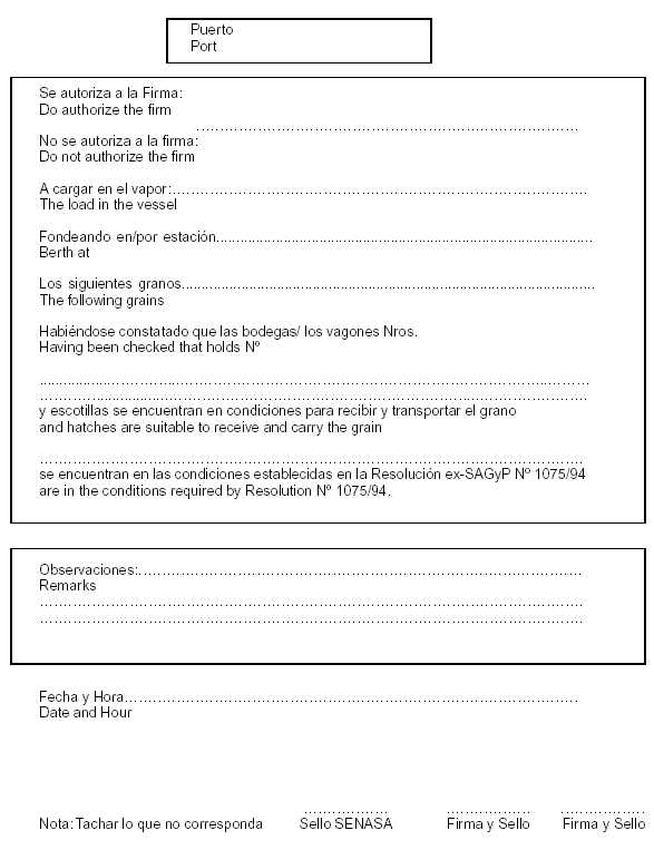 4.1. Aprobada la bodega luego de la inspección se emitirá el formulario de "Inspección de Bodegas y Autorizaciones de Embarque" correspondiente, según el modelo que obra como Anexo II de la presente norma, indicando claramente hora y día de la aprobación.