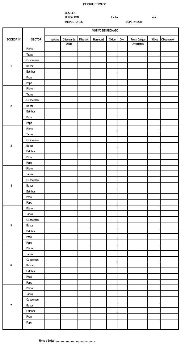 4.2. Rechazada la bodega luego de la inspección se emitirá el formulario de "Inspección de Bodegas y Autorizaciones de Embarque", según el modelo que obra como Anexo II de la presente resolución, con la palabra "RECHAZO", el cual acompañará al formulario "Informe Técnico", según el modelo que obra como Anexo III de la presente resolución.