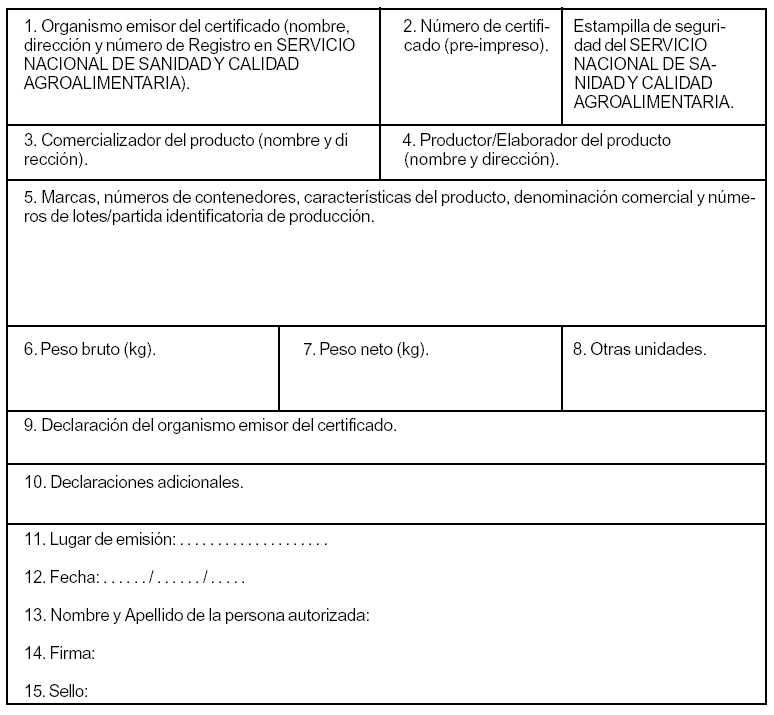 1- Las empresas certificadoras habilitadas en los Registros Nacionales confeccionarán los certificados sobre la base del modelo adjunto, con la excepción de los modelos exigidos por los países de destino.