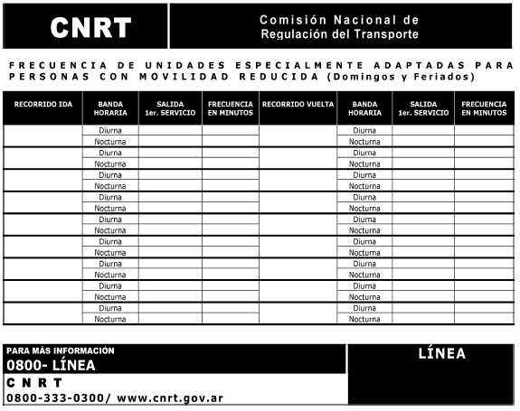 2. Se deberán hacer tres (3) cuadros diferentes de conformidad con la frecuencia a los distintos días de la semana. En el titular, luego de "FRECUENCIA DE UNIDADES ESPECIALMENTE ADAPTADAS PARA PERSONAS DE MOVILIDAD REDUCIDA" corresponde que figure: