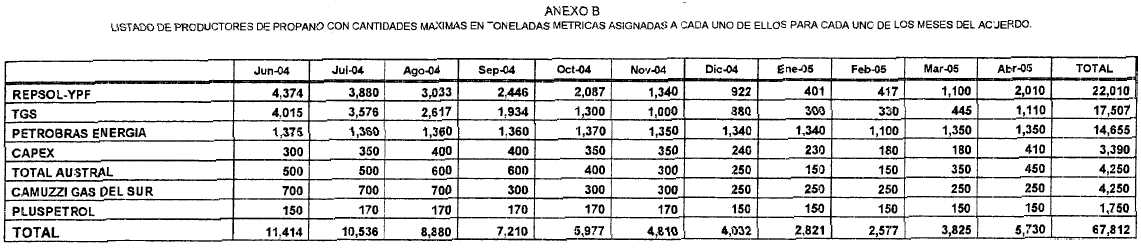 El detalle de las cantidades máximas mensuales que se comprometen a suministrar las Empresas Productoras durante el plazo del Segundo Acuerdo de Prórroga para el mes de mayo de 2004 serán las establecidas en el Anexo B del Acuerdo de Prórroga del Acuerdo de Abastecimiento de Gas Propano para Redes de Distribución de Gas Propano Indiluido, aprobado por la Resolución de la SECRETARIA DE ENERGIA Nº 419 del 23 de mayo de 2003; y para el período comprendido entre los meses de junio 2004 a abril 2005 serán las consignadas en el Anexo B del presente acuerdo. Dos o más Empresas Productoras podrán acordar reasignar entre sí sus compromisos de suministro de cantidades máximas de gas propano al Precio Acordado, siempre y cuando dicha reasignación respete la cantidad máxima establecida para cada mes del Segundo Acuerdo de Prórroga y la misma sea informada a la SECRETARIA DE ENERGIA dentro de los DIEZ (10) días de vencido el trimestre al que corresponda.