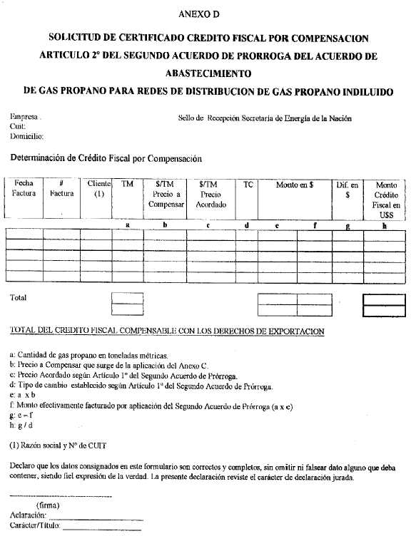 A los efectos de obtener el respectivo certificado de crédito fiscal por compensación deducible de los derechos de exportación, las Empresas Productoras deberán presentar bajo declaración jurada como única documentación: i) una copia autenticada de las facturas y/o notas de crédito de las cuales surja la venta a una o más Distribuidoras y/o Subdistribuidoras de Gas Propano Indiluido por Redes al Precio Acordado con la respectiva cantidad de gas propano en toneladas métricas en los términos del presente Segundo Acuerdo de Prórroga, ii) el formulario de solicitud de certificado de crédito fiscal por compensación que como Anexo D forma parte integrante de este Segundo Acuerdo de Prórroga, y iv) una constancia expedida por Contador Público independiente que certifique la correspondiente registración contable de la facturas y/o notas de crédito informadas indicando los libros y/o sistemas contables, debidamente autorizados, en los cuales se encuentren registradas.