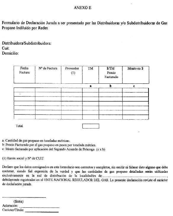 Artículo 3º.- El ENTE NACIONAL REGULADOR DEL GAS, actuando en el ámbito de su competencia, instruirá a las Distribuidoras y/o Subdistribuidoras de Gas Propano Indiluido por Redes, para que presenten ante la SECRETARIA DE ENERGIA dentro de los CINCO (5) días hábiles de concluido el mes las Declaraciones Juradas, conforme al Anexo E que forma parte integrante de este Segundo Acuerdo de Prórroga. La demora o incumplimiento de lo indicado en el párrafo precedente será considerado por la Autoridad Regulatoria una falta grave pasible de la sanción contemplada en el Artículo 10.1. inciso b) de las Reglas Básicas de la Licencia de Distribución de Gas, por cada día en que persista el incumplimiento de la obligación.
