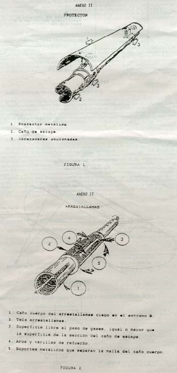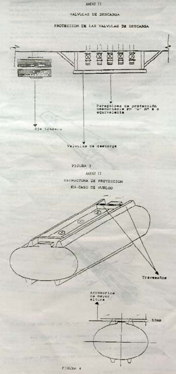 21.3. Verificar el estado de las juntas y tapas. 21.4. Verificar posición de las válvulas de descarga. 21.5. Protección de válvulas de descarga. 21.6. Verificar protección estructural contra vuelcos o choques laterales, según figura N° 3 del Anexo II. 21.7. Válvula de emergencia: 21.8. Verificar estado y funcionamiento de válvula de pie para ser accionado en caso de emergencia. 21.9. Verificar ausencia de pérdidas en cada compartimiento en forma independiente. 21.10. Válvulas de venteo: 21.11. Verificar existencia y correcto funcionamiento. 21.12. Mangueras. 21.13. Verificar el estado de conservación de la superficie exterior. 21.14. Controlar el buen estado del codo visor de acople. 21.15. Verificar continuidad eléctrica entre ambos acoples y existencia de abrazadera en ambos extremos. 21.16. Conexiones de descarga a tierra. 21.17. Se verificará la presencia y estado de las planchuelas para la descarga estática a tierra. 22 - TOMA DE AIRE DEL MOTOR 22.1. Los vehículos que posean tomas de aire externas deberán contar con una cubierta de cierre para evitar la entrada de líquidos en el proceso de carga. 23 - ELEMENTOS DE PROTECCION. 23.1. Verificar existencia y estado de los siguientes elementos: 23.2. Maza de madera dura o material antichispa. 23.3. DOS (2) colisas (tacos) de material antichispa. 23.4. Linterna blindada contra explosión. 23.5. Juego de balizas reglamentarias. 23.6. Zapatos, guantes y casco de seguridad. 24 - Inspecciones visuales complementarias. 24.1. Protección trasera para daños por accidente en vehículos equipados con tanque cisterna que dispongan de las válvulas de descarga ubicadas en dicha zona. Se inspeccionará la localización, estado y dimensiones de los paragolpes, que deberán ser tales que ofrezcan protección a dichos elementos, ante eventuales choques traseros. 24.2. En los vehículos equipados con tanque cisterna que dispongan de las válvulas de descarga delante del eje o tándem de ejes traseros-"Carga Ventral"-, se inspeccionará la localización, estado y dimensiones de las defensas, las que deberán ofrecer la adecuada protección de dichos elementos, ante eventuales choques laterales. 24.3. Asimismo, para el caso de las cisternas que tengan incorporado el sistema de carga ventral, se deberá verificar la existencia y correcto funcionamiento del sensor de sobrellenado. 24.4. El paragolpes trasero o protección trasera para daños por accidente deberá cumplir con los siguientes requisitos: Localizarse a CERO COMA QUINCE METROS (0,15 m.) del componente posterior del vehículo utilizado para carga o descarga, o del componente que contenga la carga mientras el vehículo está en tránsito. La estructura del paragolpes estera diseñada para evitar daños que deriven en pérdida de carga ante un impacto trasero. 24.5. Verificar la existencia y estado de la escalera de acero, para acceder a la parte superior del tanque cisterna. 24.6. Verificar la existencia y estado de la estructura o jaula antivuelco o protección superior del tanque cisterna, la que no deberá presentar óxidos, golpes o deformaciones. 24.7. En la inspección visual externa o interna, según corresponda, eventualmente con instrumentos de medición, el tanque cisterna no deberá presentar en el recipiente, sus accesorios, partes estructurales y equipos de operación lo siguiente: 24.7.1. Areas corroídas, gastadas, con espesor menor al de diseño más su tolerancia. 24.7.2. Golpes o deformaciones por golpes, en las soldaduras o que incluyan una soldadura, con una profundidad máxima de CERO COMA CERO QUINCE METROS (0.015 m.). 24.7.3. Golpes o deformaciones por golpes, que no incluyan una soldadura, con una profundidad máxima permitida de UNA DECIMA (1/10) de la dimensión total del golpe. 24.7.4. En ningún caso la profundidad de los golpes o deformaciones por golpes debe exceder los CERO COMA CERO TREINTA MILIMETROS (0,030 mm.). 24.7.5. El espesor mínimo del armazón, sus elementos componentes, estructurales y accesorios, no debe ser menor al de diseño más su tolerancia. 24.7.6. Defectos de soldadura sobre la estructura o en las soldaduras, de acuerdo a criterios aceptados por las normas IRAM. 24.7.7. No debe presentar goteos o pérdidas o escurrido de líquidos. 24.7.8. Los dispositivos de emergencia y válvulas de stop con auto cierre, válvulas de exceso de caudal y dispositivos de cierre remoto deben estar exentos de la corrosión, distorsión, erosión y cualquier otro daño externo que pueda evitar el funcionamiento seguro. Los dispositivos de cierre remoto y las válvulas de stop con auto cierre deben operarse para verificar su correcto funcionamiento. 24.7.9. Los cerrojos tuercas, fusibles y elementos faltantes deben reemplazarse y los cerrojos tuercas flojos deben ajustarse. 24.7.10. Todos los accesorios principales y aditamentos estructurales del tanque, incluyendo los accesorios del sistema de amortiguamiento de vibraciones entre la estructura y la cisterna, sus elementos de montaje y sujeción al chasis, deben inspeccionarse para verificar si presenta corrosión o daños. 24.7.11. Cuando el tanque cisterna tenga "entrada de hombre", ella y sus juntas serán inspeccionadas por goteo, en la inspección visual, o a presión en las pruebas periódicas respectivas. 24.7.12. El sistema de alivio de presión, las válvulas fusible de venteo o alivio de presión deben ser externamente inspeccionadas para verificar cualquier corrosión o daño que pueda impedir el funcionamiento seguro, y no deben presentar fallas al abrir y cerrar, a la presión establecida por el fabricante. 24.7. 13. Las juntas de cualquier abertura completa deben ser inspeccionadas y eventualmente probadas. 24.7.14. El interior de los tanques cisterna, cuando éstos tengan "entrada de hombre", será inspeccionado y verificado su revestimiento mediante un detector de alta tensión, de acuerdo al espesor del revestimiento. 25 - Los vehículos que transporten gases licuados de petróleo de