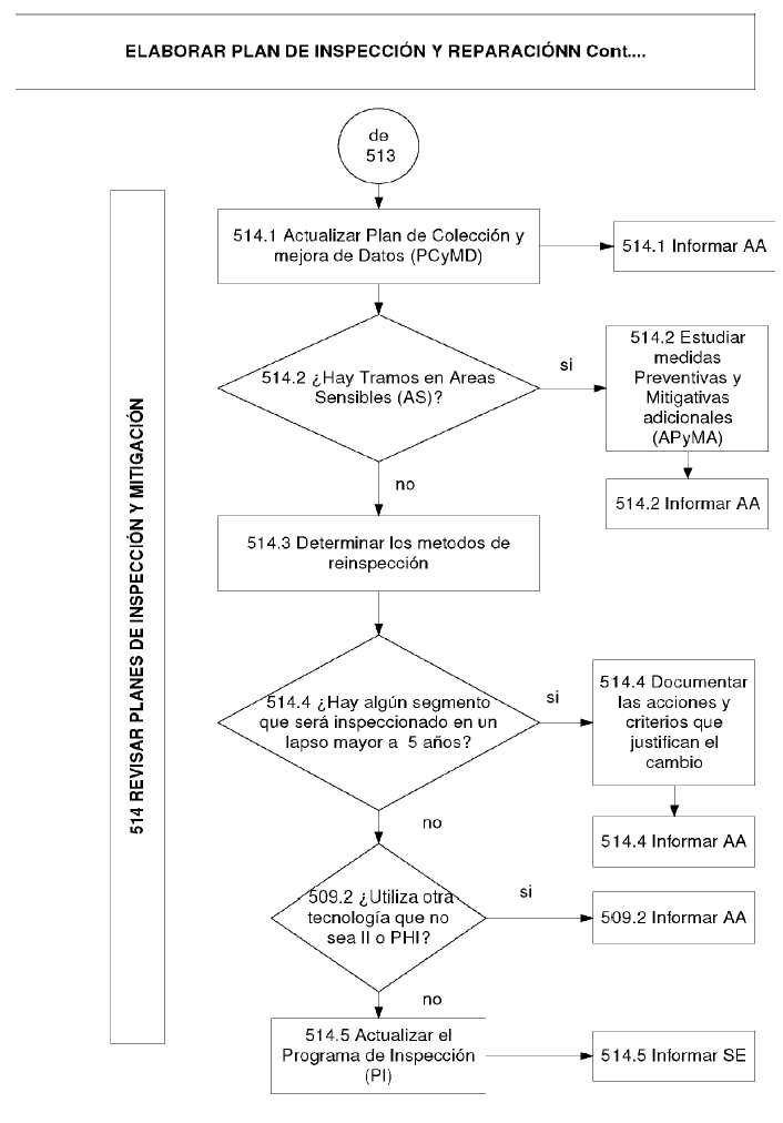 514 REVISAR PLANES DE INSPECCION Y MITIGACION (PCyMD) 514.1 Actualizar Plan de Colección y Mejora de Datos (PCyMD) El operador debe presentar el Plan de Colección y Mejora de Datos (PCyMD) donde describirá las acciones que implementará en el período entrante en lo que hace a la mejora de los datos de la Base de Datos (BD). Deberá describir en qué tramos comprometerá recursos en mejorar la calidad de los datos. Luego de haber realizado el ARB y presentado el Plan de Relevamiento Base (PRB), el operador implementará un método de Análisis de Riesgo (AR) acorde con las aspiraciones del PGI. En esta etapa es necesario definir qué tipo de datos y de qué calidad, serán necesarios para cargar la Base de Datos (BD) que alimentará el Análisis de Riesgo (AR) y justificará las decisiones de control de la integridad del sistema. Con un mayor y mejor conocimiento de los datos se podrán tomar acciones más certeras y precisas, por lo que, el resultado será que disminuirá más el riesgo con menor mantenimiento. El desconocimiento de algunas variables puede conducir a tomar medidas generales y acciones más dispersas para reducir el riesgo, aumentando así los recursos necesarios para el mantenimiento. 514.2 Estudiar e implementar las Acciones Preventivas y Mitigativas Adicionales (APyMA) en tramos ubicados en Areas Sensibles (AS) En los casos que haya tramos que atraviesan Areas Sensibles (AS) o que las consecuencias de un derrame pudieran afectar Areas Sensibles (AS), el operador deberá estudiar Acciones Preventivas y Mitigativas Adicionales (APyMA) para disminuir el riesgo. Esta disminución del riesgo se hará trabajando sobre los dos factores que lo componen. Para disminuir la probabilidad de falla el operador deberá estudiar medidas preventivas, en forma independiente sobre cada amenaza posible y medidas concretas para disminuir la probabilidad de ocurrencia de una falla (por ej: remover defectos de corrosión para disminuir la probabilidad de rotura, aplicar losetas para prevenir un daño por maquinaria en un basural, mejorar la limpieza e inhibición para disminuir la probabilidad de falla por corrosión interna etc.). Las acciones preventivas tendientes a disminuir la probabilidad de falla son -pero no se limitan alas siguientes: · Mejorar las prácticas de prevención de daños.· Mejorar el monitoreo de la protección catódica.· Acortar los intervalos entre inspecciones.· Implementar y/o mejorar el sistema de detección de pérdidas.· Aumentar la capacitación.· Instalar losetas sobre la cañería.Las acciones mitigativas tendientes a disminuir las consecuencias de una falla son -pero no se limitan a las que siguen: · Instalar válvulas de línea automáticas.· Mejorar el sistema de emergencia.· Mejorar los planes de evacuación.· Mejorar el tiempo de respuesta ante una fuga.El operador deberá informar a la Autoridad de Aplicación el conjunto de Acciones Preventivas y Mitigativas Adicionales (APyMA) que se compromete a implementar en el próximo período para las diferentes Areas Sensibles (AS) identificadas. 514.3 Determinar el / los métodos de reinspección En base a la experiencia colectada durante las inspecciones, las VERIFICACIONES DIRECTAS (VD) y los resultados del Análisis de Riesgo (AR), el operador deberá determinar el o los métodos de inspección para una nueva inspección siguiendo los lineamientos descritos en el punto 509.1. Los métodos que elija el operador para evaluar la integridad de los caños cuya soldadura longitudinal sea tipo ERW o lap welded y sean susceptibles a roturas en las mismas, deberán ser capaces de evaluar la integridad de la soldadura detectando corrosión en la soldadura longitudinal así como deformaciones geométricas. 514.4 Segmento o tramo que pueda ser inspeccionado en un lapso mayor a 5 años El presente Reglamento prevé la posibilidad de prolongación del período de 5 años para determinadas situaciones, para ello se solicitará: Caso 1 - Una justificación de ingeniería que demuestre que la integridad del tramo puede ser mantenida realizando otras actividades hasta que se efectúe la siguiente inspección. Caso 2 - La necesidad de diferir la inspección hasta que esté disponible la tecnología apropiada para realizarla. La Autoridad de Aplicación deberá ser notificada con un año de antelación para el Caso 1 y con 180 días para el Caso 2. En ambas situaciones deberán documentarse las acciones y criterios que justifican el cambio. 514.5 Actualizar el Plan de Inspección (PI) Basado en los resultados del Análisis de Riesgo (AR), luego de haber incorporado los datos provenientes del Plan de Relevamiento Base (PRB), reparaciones y Acciones Preventivas y Mitigativas Adicionales (APyMA), el operador debe establecer el cronograma para la próxima inspección de las líneas. La reinspección debe realizarse dentro de los 5 años de cumplida la última inspección. El Plan de Inspección (PI) deberá ser informado a la Autoridad de Aplicación siguiendo el cronograma establecido en este Reglamento.