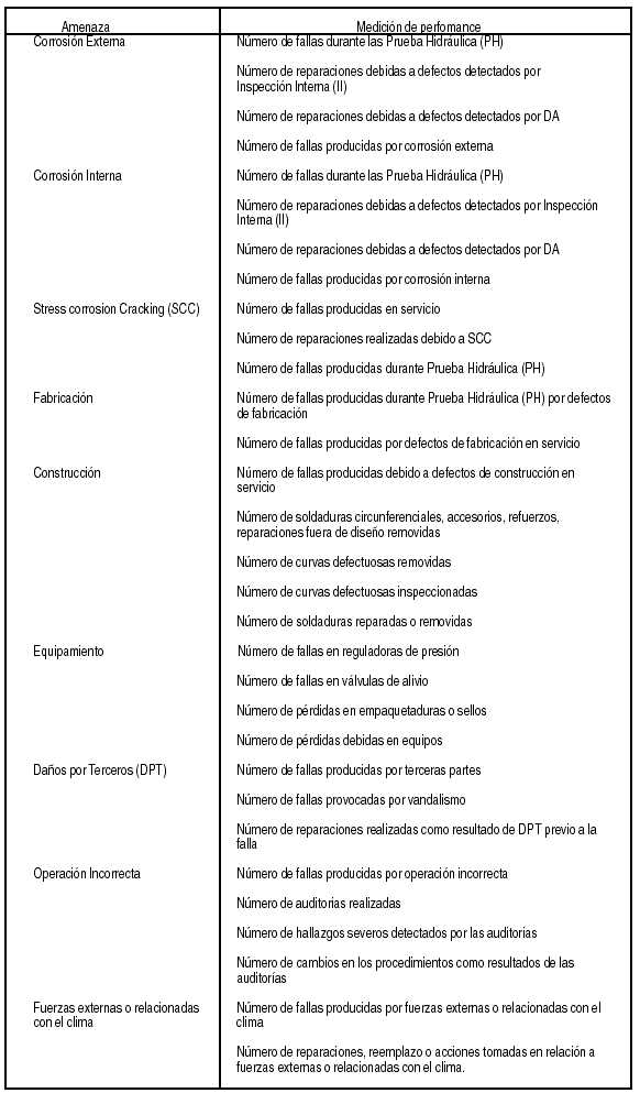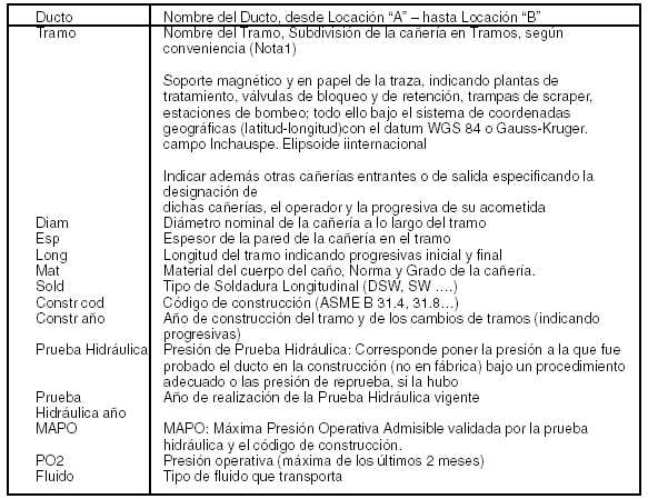 NOTA (1): Se enviará a la Autoridad de Aplicación un resumen, preferentemente de no más de dos carillas con la información requerida. NOTA (2): Se enviará a la Autoridad de Aplicación un listado con la información mínima necesaria para comunicar la información requerida. NOTA (3): Se enviará a la Autoridad de Aplicación el "Resumen Ejecutivo" del Informe Final de Derrame, Fuga o Rotura. La documentación y registros de respaldo de la información permanecerán en poder del operador, pero debe estar disponible ante cualquier requerimiento de la Autoridad de Aplicación. PARTE 3: PROCESO DE IMPLEMENTACION DEL PLAN DE GERENCIAMIENTO DE INTEGRIDAD 507 COLECCION E INTEGRACION DE DATOS 507.1 Identificar Ductos Alcanzados El operador debe identificar todas las líneas de cañerías incluidas en el alcance de este documento. 507.2 Colectar datos El operador debe colectar toda la información disponible para comenzar con el desarrollo del PGI. El operador deberá presentar a la Autoridad de Aplicación los Datos Básicos solicitados en el Anexo 1 del presente Reglamento. Ante el desconocimiento de alguno de los datos el operador deberá adoptar el valor más conservador. 507.3 Integrar Datos El operador deberá desarrollar e implementar un proceso de colección y de integración de datos que permita obtener y manejar en forma sistemática la información antes requerida para cada uno de los tramos de su sistema. Deberá desarrollarse un sistema de referenciamiento común (en unidades consistentes) a efectos de permitir que todos los datos colectados puedan ser analizados para una misma localización. El sistema elegido para integrar los datos debe estar georreferenciado. El error inherente al método desarrollado para la integración de los datos debe ser compatible con el método de Análisis de Riesgo (AR) que se adopte. 508 CONTENIDOS DEL ANALISIS DE RIESGO BASICO (ARB) 508.1 Identificación de las amenazas aplicables El operador debe analizar para cada tramo alcanzado por el presente RT la aplicabilidad de cada una de las siguientes amenazas: a - Dependientes del tiempo transcurrido: a1 - Corrosión interna. a2 - Corrosión externa. a3 - Stress Corrosion Cracking (SCC). a4 - Fatiga. b - Estáticas o residentes: b1 - Defectos de fabricación en caño y accesorios: - Soldadura longitudinal. - Cuerpo del caño y material. b2 - Construcción: - Soldaduras circunferenciales defectuosas. - Soldaduras defectuosas. - Curvas con arrugas o pliegues. - Roscas y cuplas defectuosas. b3 - Equipamiento: - Fallas en juntas, empaquetaduras y retenes. - Fallas en equipos y dispositivos de alivios. - Fallas en sellos de bombas y empaquetaduras. - Misceláneos. c - Independientes del tiempo: c1 - DPT (daños mecánicos): - Daños ocasionados por primeras (personal del operador), segundas (personal contratado por el operados) o terceras (personal ajeno al operador) partes con consecuencias instantáneas. - Idem anterior con modo de manifestación retardada. - Vandalismo. c2 - Operación incorrecta: - Procedimientos de operación incorrecta. c3 - Fuerzas externas relacionadas con el clima: - Tiempo extremadamente frío. - Descargas atmosféricas. - Lluvias copiosas o inundaciones. - Movimientos del suelo. 508.2 Identificación somera de Areas Sensibles (AS) El operador deberá identificar las zonas donde las cañerías alcanzadas por el presente Reglamento cruzan Areas Sensibles (AS). En esta etapa del proceso de implementación del PGI podrá hacer una identificación somera de las Areas Sensibles (AS), ya que es esperable que no cuente con la información detallada necesaria para un análisis exhaustivo. 508.3 Segmentación por tramos Una división en tramos apropiada permitirá asignar los recursos de mantenimiento en una forma más eficiente. 508.4 Análisis de Riesgo Básico (ARB) El Operador debe seleccionar un método de Análisis de Riesgo (AR) apropiado para su sistema y para el PGI. En esta etapa basta con un método que permita priorizar en forma somera las actividades de inspección para la elaboración del Plan de Relevamiento Base (PRB). El ARB debe ser conducido, como mínimo, para cada uno de los tramos incluidos en el alcance del presente Reglamento. En el proceso deben considerarse todas las amenazas posibles. En esta etapa se deberá asumir mucha de la información que requiere el método de Análisis de Riesgo (AR), lo cual dependerá de la calidad y cantidad de datos de que disponga el operador. El objetivo de esta primera corrida de análisis de riesgo es establecer las bases técnicas y prioridades para la elaboración del Plan de Relevamiento Base (PRB).