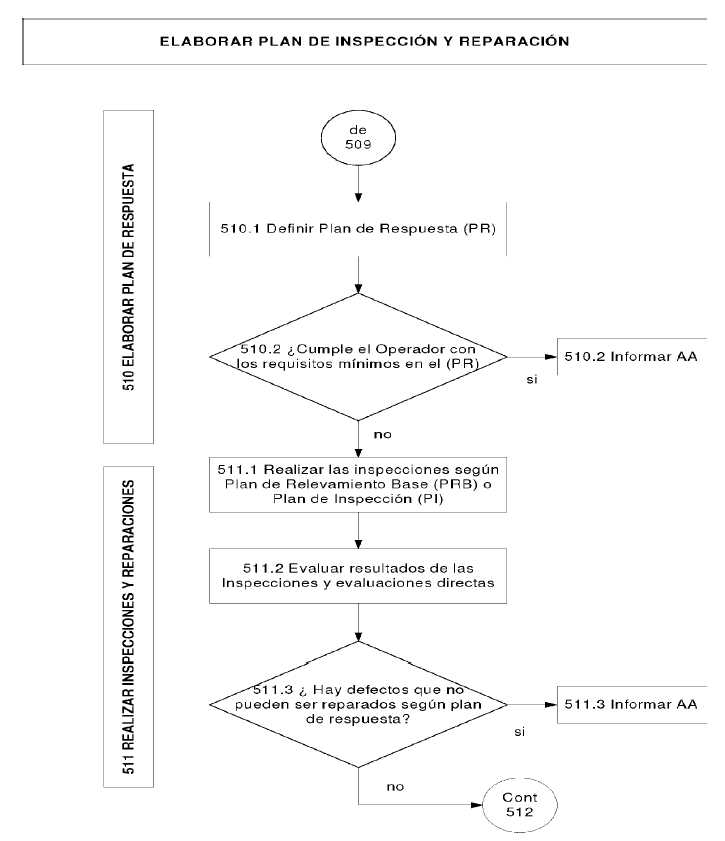 A 463.1 Instalaciones nuevas CAPITULO X [ A ]: PLAN DE GERENCIAMIENTO DE INTEGRIDAD PARTE 1: INTRODUCCION Y OBJETIVOS 501 INTRODUCCION 501.1 Generalidades Esta sección describe un proceso para gerenciar la integridad de un sistema de transporte de hidrocarburos líquidos. Dicho proceso se describe en el gráfico "Elementos del Plan de Gerenciamiento de Integridad". Estos elementos en conjunto proveen la base para un plan de gerenciamiento de integridad comprensivo, sistemático e integrado. Las definiciones de la terminología utilizada en el presente Capítulo se encuentran en la sección 504. 501.2 Propósitos y Objetivos El objetivo del presente Capítulo de este Reglamento es que los operadores de sistemas de transporte de hidrocarburos líquidos por cañerías, implementen un Plan de Gerenciamiento de Integridad (PGI), que a través de la sistematización y análisis de la información, permita adecuar las prácticas de Operación y Mantenimiento, evitando la ocurrencia de derrames o fugas que puedan dañar a los empleados, al público en general, al ambiente y a otras instalaciones. Atento a ello, se requiere que dichos operadores desarrollen planes de integridad que contengan las siguientes acciones básicas: · Evaluación de los riesgos derivados de las amenazas existentes en los distintos tramos del sistema de cañerías.· Evaluación de la integridad de las cañerías, después de haber implementado el Plan de Relevamiento Base (PRB), al menos cada 5 años, mediante herramientas de Inspección Interna (II) o Prueba Hidráulica (PH).· Reparación de los defectos encontrados con tiempos de respuesta prescriptos según su severidad.· Implementación de Acciones Preventivas y Mitigativas Adicionales (APyMA) para Areas Sensibles (AS).· Informar a la Autoridad de Aplicación en forma periódica los planes a implementar en el ciclo anual próximo y los resultados del ciclo anual anterior y las desviaciones a los requerimientos que en el presente Reglamento se especifican.· Implementación de un Plan de Gerenciamiento de Integridad (PGI) que garantice el cumplimiento de las disposiciones de esta sección.501.3 Elementos del Plan de Gerenciamiento de Integridad (PGI) El PGI se implementará en distintas etapas, a saber: · Recopilar e integrar la información existente.· Elaborar un Análisis de Riesgo Básico (ARB).· Elaborar un Plan de Relevamiento Base (PRB).· Elaborar un Plan de Respuesta (PR).A partir de este punto, se inicia un ciclo anual o proceso continuo en el cual se implementarán las siguientes actividades planificadas: · Realizar las inspecciones planificadas (Inspección Interna (II), Prueba Hidráulica (PH) o cualquier otro medio que garantice un nivel de comprensión equivalente).· Realizar las reparaciones que surjan del resultado de las inspecciones.· Actualizar, integrar y revisar la información colectada.· Recalcular el riesgo con la experiencia acumulada del ciclo anterior.· Elaborar un Plan de Colección y Mejora de Datos (PCyMD).· Revisar el Plan de Inspección (PI) y el Plan de Acciones Preventivas y Mitigativas Adicionales (APyMA).§ Evaluar la efectividad del sistema.