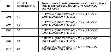 Donde: Ÿ GEC: Gasto consolidado en educación, ciencia y tecnología.Ÿ PIB: Producto Interno Bruto.Ÿ GEN: Gasto en educación, ciencia y tecnología del Gobierno nacional.Ÿ 40% = Participación del Gobierno nacional en el esfuerzo de inversión adicional para el cumplimiento de la Meta de crecimiento anual de GEC/PIB.El Gobierno nacional financiará con sus recursos los programas destinados a cumplir los objetivos especificados en los incisos j) y k) del artículo 2° de la presente ley en lo atinente a instituciones y organismos dependientes del Estado nacional. La distribución de los recursos incrementales de jurisdicción nacional destinados a la educación no universitaria, universitaria y el sistema científico-tecnológico deberá realizarse conforme a las participaciones actuales del Gasto Educativo Consolidado del año 2005. ARTICULO 5º — A fin de lograr el cumplimiento de los objetivos descriptos en el artículo 2° de la presente ley, el gasto consolidado en educación, ciencia y tecnología de las provincias y de la Ciudad Autónoma de Buenos Aires se incrementará anualmente —respecto del año 2005—, de acuerdo a los porcentajes que se consignan en el siguiente cuadro: