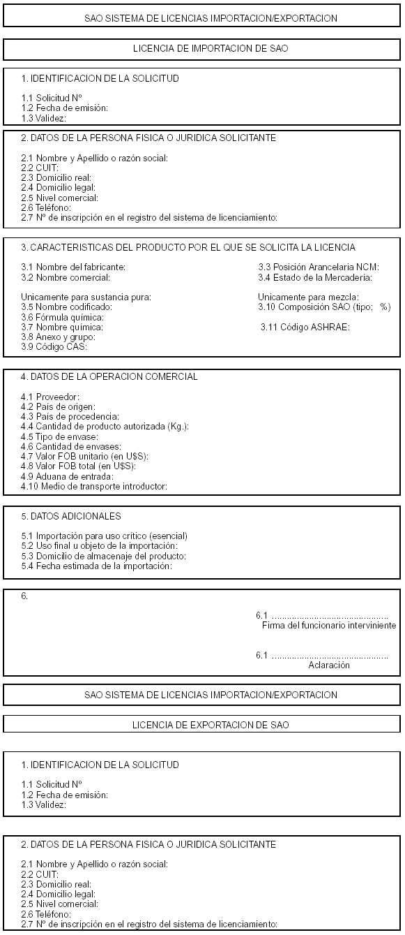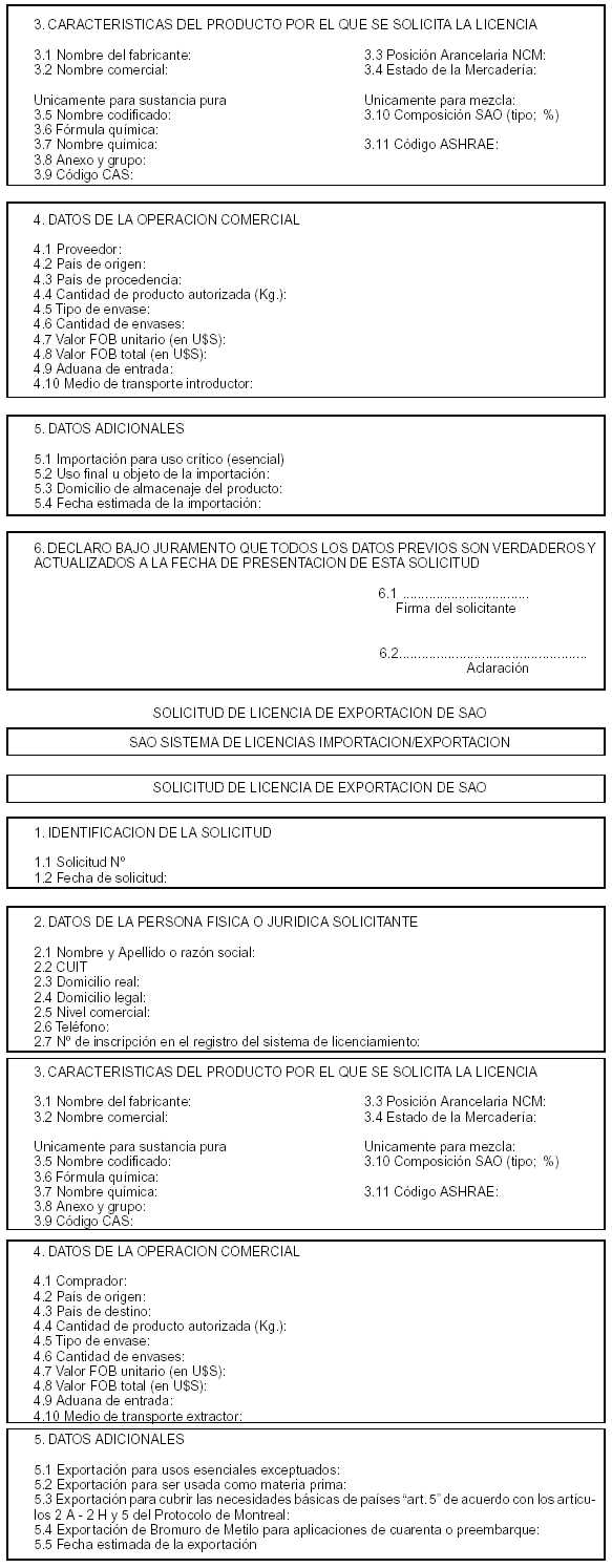 Anexo VII: Instructivo para la solicitud de licencia 1. Los interesados en realizar una solicitud de licencia deberán acceder a la pantalla de entrada al Sistema de Licencias SAO (por intermedio del link ubicado en la página web de la SECRETARIA DE AMBIENTE Y DESARROLLO SUSTENTABLE o bien escribiendo en la barra de direcciones de su explorador la dirección de la página de entrada). Una vez allí ingresarán utilizando el nombre de usuario y clave de acceso suministrados vía email al momento del alta. 2. Realizado el ingreso, el sistema mostrará el perfil (transacciones habilitadas) para el usuario. Seleccionando la opción "Solicitud de licencia" se accede a las pantallas que permiten cargar los datos de una solicitud. 3. Estas pantallas están divididas en dos marcos: el de la izquierda permite el ingreso de datos mientras que el de la derecha permite visualizar todos los datos cargados y proceder a su modificación si fuera necesario. 4. En la primera pantalla, en el marco de la izquierda, se presentan los datos del interesado que figuran en el registro del sistema y se presenta un menú desplegable para que se opte por el tipo de solicitud que se desea realizar. 5. A continuación se presenta una pantalla que permite ingresar las características del producto para el que se solicita licencia, debiendo indicarse: a) Nombre del fabricante b) Nombre comercial c) Posición Arancelaria d) Estado de la mercadería e) Si se trata de una sustancia pura o una mezcla (por medio de un menú desplegable) Si se elige "sustancia pura" la siguiente pantalla que se presenta permite ingresar los datos relativos a: f) Nombre codificado, el cual se selecciona por intermedio de un menú desplegable que contiene todos los nombres codificados de las sustancias controladas mencionadas en los Anexos V y VI de la presente resolución (automáticamente al realizar una selección de sustancia el sistema cargará y mostrará en pantalla la fórmula química y el nombre químico asociado así como el Anexo-Grupo del Protocolo de Montreal al cual pertenece la SAO) g) Código CAS Si se elige "mezcla" el sistema presentará una pantalla que permite ingresar los datos relativos a: h) Código ASHRAE (si lo tuviera). i) Nombre codificado del componente de la mezcla, el cual se selecciona por intermedio de un menú desplegable que contiene todos los nombres codificados de las sustancias controladas mencionadas en los Anexos V y VI de la presente resolución (automáticamente al realizar una selección de sustancia el sistema cargará y mostrará en pantalla la fórmula química y el nombre químico asociado así como el Anexo-Grupo del Protocolo de Montreal al cual pertenece la SAO). j) La parte porcentual del componente ingresado en la mezcla. k) Si la mezcla para la cual se solicita licencia tuviera más de un componente el solicitante podrá cargar los mismos por intermedio del link destinado a cargar otro componente de la mezcla. 6. A continuación el sistema permite cargar los datos de la operación comercial: a) Proveedor b) País de origen (para solicitudes de licencia de importación) o País de destino (para solicitudes de licencia de exportación) c) País de procedencia d) Cantidad de producto que se solicita autorizar, expresada en Kilogramos (Kg.) e) Tipo de envase f) Cantidad de envases g) Valor FOB unitario expresado en U$S h) Valor FOB total expresado en U$S i) Aduana de entrada (para solicitudes de licencia de importación) o Aduana de salida (para solicitudes de licencia de exportación) j) Medio de transporte introductor 7. Finalmente se presenta una pantalla para la carga de datos adicionales. Para el caso de solicitudes de licencia de importación éstos son: a) La indicación de si se trata una importación para uso crítico (esencial), la cual será seleccionable únicamente para aquellos importadores que hubieran sido habilitados para operar bajo tal modalidad. b) Uso final u objeto de la importación, el cual será seleccionable desde un menú desplegable. c) Domicilio de almacenaje del producto d) Fecha estimada de la importación Para el caso de solicitudes de licencia de exportación estos datos serán: e) Indicación de si se trata de una exportación para usos esenciales exceptuados f) Indicación de si se trata de una exportación para ser usada como materia prima g) Indicación de si se trata de una exportación para cubrir las necesidades básicas de países "art. 5" de acuerdo con los artículos 2ª-2H y 5 del Protocolo de Montreal h) Indicación de si se trata de una exportación de bromuro de metilo para aplicaciones de cuarentena o preembarque (esta opción se habilitará únicamente en caso que la sustancia elegida anteriormente hubiera sido bromuro de metilo). 1. Estas indicaciones se realizarán por intermedio de un menú desplegable que tiene únicamente dos opciones "SI" y "NO", encontrándose todas ellas configuradas en "NO" al acceder a la pantalla. En caso de que el solicitante no cuente con la información suficiente para realizar estas indicaciones deberá dejarlas en "NO". i. Fecha estimada de la exportación 8. Finalizada la carga de datos y aceptada la solicitud el sistema mostrará un mensaje de salida con la indicación de que el interesado recibirá un email en la dirección de correo electrónico especificada al momento de la registración para que pueda acceder al formulario de solicitud de licencia. El formato del email aludido será: Asunto: Trámite de solicitud de licencias de SAO Texto: Por medio del presente le hacemos llegar la confirmación del trámite de solicitud de licencia de SAO. Utilice el siguiente botón para acceder al formulario de solicitud que deberá guardar en su computadora e imprimir a fin de presentar ante las autoridades correspondientes. Ayuda: ¿Cómo visualizar e imprimir el formulario? Ayuda: ¿Cómo guardar el formulario en su computadora?