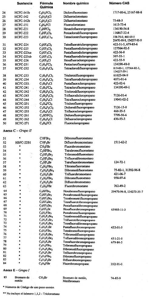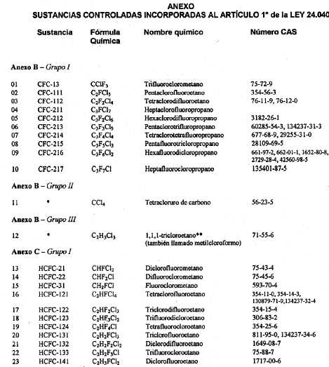 Que la Ley N° 24.040 sobre Compuestos Químicos, establece en su artículo 1° que quedan comprendidos en las disposiciones de esa ley, bajo la denominación de sustancias controladas, los compuestos químicos incluidos en el Anexo "A" del PROTOCOLO DE MONTREAL, que se identifican como CFC-11, CFC-12, CFC-113, CFC-114, CFC-115; Halón 1211, Halón 1301 y Halón 2402, y que su producción, utilización, comercialización, importación y exportación quedarán sometidas a las restricciones establecidas en el citado Protocolo y en la Ley de referencia.