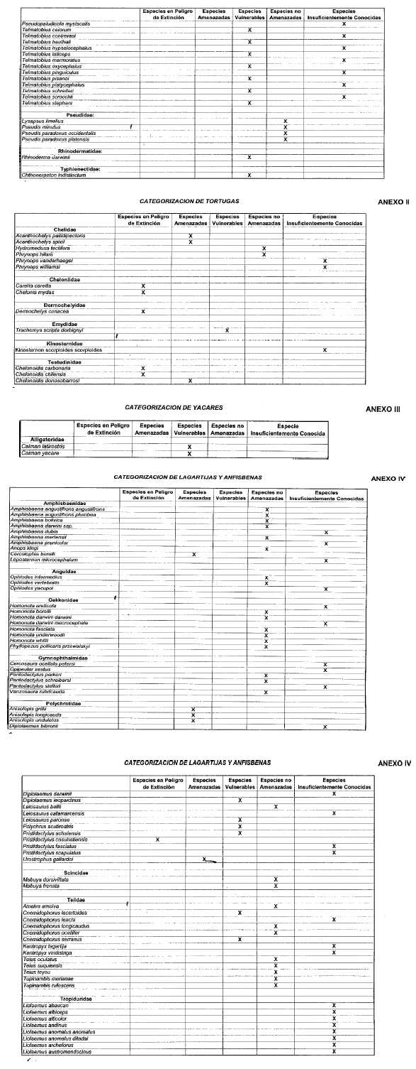 Artículo 1° — Asígnase el siguiente ordenamiento para las especies de Anfibios y Reptiles autóctonos de acuerdo a lo establecido en el artículo 4° del Decreto 666/97 reglamentario de la Ley 22.421, que obra como Anexos I al V y que forman parte de la presente Resolución.