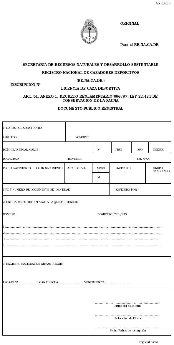Bs. As.. 26/3/98 VISTO el expediente Nº 411/98 del Registro de esta Secretaría de Recursos Naturales y Desarrollo Sustentable y el Decreto Nº 666/97, y CONSIDERANDO: Que la creación del Registro Nacional de Cazadores Deportivos constituye un medio apto para el efectivo ordenamiento de la actividad cinegética. Que corresponde dar cumplimiento a lo previsto en el artículo 61 del Decreto No 666/97 por el cual fue creado el Registro Nacional de Cazadores Deportivos. Que ha tomado la intervención que le compete la DIRECCION GENERAL DE COORDINACION DE ASUNTOS JURIDICOS. Que la suscripta está facultada para dictar el presente acto administrativo en virtud de la Ley Nº 22.421, el Decreto Nº 666/97 y los Decretos N° 1381/86, N° 1412/96 y N° 146/98. Por ello, LA SECRETARIO DE RECURSOS NATURALES Y DESARROLLO SUSTENTABLE RESUELVE: Artículo 1º — El Registro Nacional de Cazadores Deportivos creado por el artículo 61 del Decreto 666/97, funcionará en el ámbito de la Dirección de Fauna y Flora Silvestres, dependiente de la Subsecretaría de Desarrollo Sustentable de esta Secretaría. Art. 2º — Funciones: El Registro Nacional de Cazadores Deportivos (RE.NA.CA.DE), tendrá a su cargo la emisión de la Licencia Nacional de Cazador Deportivo y la confección de un registro de todas las personas físicas a las que se le haya otorgado dicha Licencia. Art. 3º — Delegación: El RE.NA.CA.DE. delegará en las instituciones privadas de caza deportiva, que acrediten el cumplimiento del artículo 69 del Anexo I del Decreto N° 666/97, dentro de los treinta (30) días a partir de la entrada en vigencia de la presente resolución, el trámite previo a la emisión de las Licencias Nacionales de Cazador Deportivo y la entrega material de las mismas a los interesados. (Nota Infoleg: Por art. 1º de la Resolución Nº 155/99 de la Secretaría de Recursos Naturales y Desarrollo Sustentable B.O. 16/03/1999, se suprime el plazo de treinta (30) días que establece el presente artículo para la acreditación ante el Registro Nacional de Cazadores Deportivos (RENACADE) de todas aquellas entidades de derecho privado aquí previstas, las cuales podrán realizar dicha acreditación en todo momento.) Art. 4º — Organismos Provinciales: Se delegan en las autoridades provinciales competentes que adhieren al régimen de la presente, las tramitaciones vinculadas a la emisión de la Licencia Nacional de Cazador Deportivo. Art. 5º — Tramitación: Las instituciones privadas autorizadas, recibirán la solicitud de Licencia de Cazador Deportivo en un formulario por triplicado. El trámite deberá ser elevado al RE.NA.CA.DE. dentro de diez (10) días de hábiles de recibida la solicitud, junto con su opinión respecto a la procedencia del otorgamiento de la Licencia de Cazador. Art. 6º — Cancelación y suspensión de Inscripción: La tramitación de las solicitudes de extensión de licencias efectuada en contravención con las disposiciones del Anexo del Decreto 666/97 y/o de la presente Resolución, traerá aparejada la suspensión o cancelación de la inscripción de la entidad correspondiente ante el RE.NA.CA.DE, previo dictamen del Comité Asesor Permanente. Art. 7º — Organización: La Secretaría de Recursos Naturales y Desarrollo Sustentable proveerá personal administrativo para el funcionamiento del RE.NA.CA.DE, durante un plazo máximo de noventa días, a partir de la entrada en vigencia de la presente Resolución. En dicho plazo, el Comité Asesor para la Caza Deportiva deberá proponer la organización y funcionamiento de una unidad Secretaría, en orden a lo siguiente: a) La contratación de personal por instituciones privadas dedicadas a la Caza Deportiva, en cuyo caso el organismo facilitará las instalaciones para el normal desempeño de las funciones, de acuerdo a sus posibilidades. b) Perfeccionada dicha contratación, el organismo determinará la continuación de la afectación de (1) un integrante de la planta de personal permanente o no permanente, en forma definitiva o provisoria, en dicha secretaría. Art. 8º — FONDOS: Los recursos del Registro Nacional de Cazadores Deportivos, se conformarán de los siguientes ingresos: a) Los aranceles que perciba por el desenvolvimiento de la actividad registral, conforme a lo establecido en el artículo 62 del Decreto 666/97. b) Los aportes privados, donaciones y legados que reciba, cuyo mecanismo de gestión será a propuesta del Comité Asesor Permanente del RE.NA.CA.DE, en un plazo de noventa (90) días de la entrada en vigencia de la presente Resolución. Art. 9º — Aranceles: El arancel de emisión de la primera Licencia Nacional de Cazador Deportivo será veinte (20) pesos, y tendrá una validez de cinco (5) años a partir de la fecha de emisión. La renovación se efectuará de modo quinquenal, debiendo abonarse el mismo arancel en cada renovación. Art. 10. — Pago: El comprobante de pago del arancel acompañará la solicitud de la Licencia de Cazador Deportivo. El pago del arancel será efectuado en el Banco de la Nación Argentina, sucursal correspondiente a la Jurisdicción en la cual se inicie el trámite. El incumplimiento de esta obligación obstará la extensión de la licencia. Art. 11. — Permisos de Caza: La obtención de la Licencia de Cazador Deportivo, no exime a su titular del cumplimiento de los requisitos exigibles para la actividad cinegética en las respectivas Jurisdicciones provinciales ni reemplaza los permisos de caza que deban extenderse en estos. Invítase a las autoridades provinciales competentes a requerir la Licencia de Cazador Deportivo, previo a la extensión del permiso de caza provincial. Art. 12. — Crear el Comité Asesor Permanente del Registro Nacional de Cazadores Deportivos, el cual estará conformado por un representante de la Dirección Nacional de Desarrollo Sustentable de la Subsecretaría de Desarrollo Sustentable de la Secretaría de Recursos Naturales y Desarrollo Sustentable, un repre