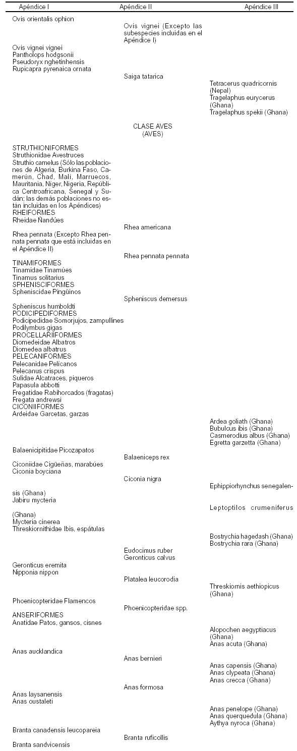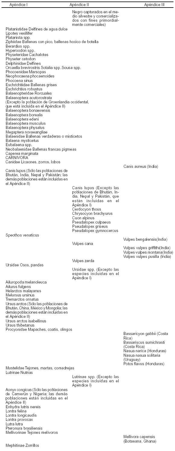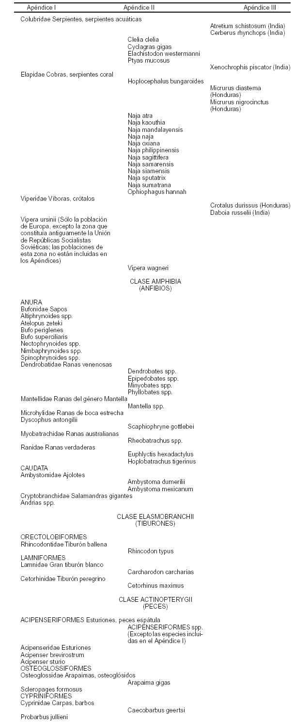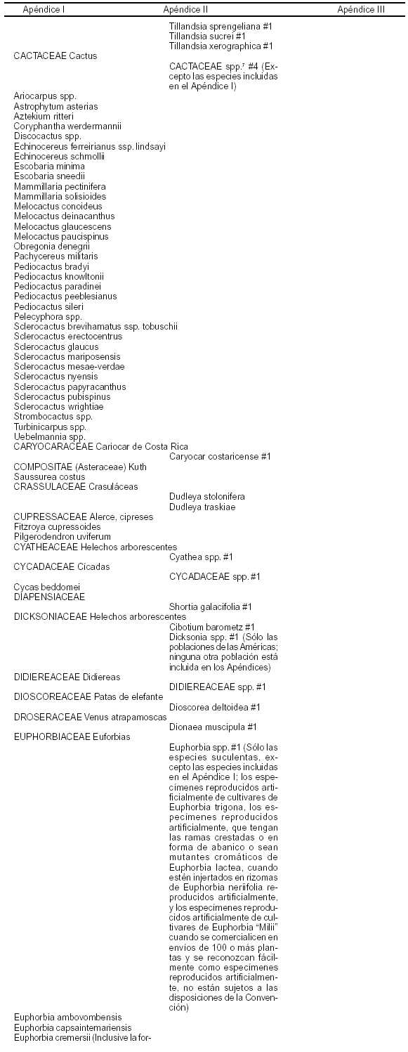 Bs. As., 1/3/2005 VISTO el expediente Nº 1-2002-5351000034/05-0 del registro de esta Secretaría de Ambiente y Desarrollo Sustentable, la Convención sobre el Comercio Internacional de Especies Amenazadas de Fauna y Flora Silvestres, aprobada por Ley Nº 22.344, su Decreto Reglamentario Nº 522 del 5 de junio de 1997, y CONSIDERANDO: Que la CONVENCION SOBRE EL COMERCIO INTERNACIONAL DE ESPECIES AMENAZADAS DE FAUNA Y FLORA SILVESTRE (CITES), a la cual la Argentina adhirió mediante la sanción de la Ley Nº 22.344, establece en su Artículo XV, (Enmiendas a los Apéndices) que en reuniones de la Conferencia de las Partes, las enmiendas adoptadas entrarán en vigor para todas las Partes noventa días después de la reunión, con la excepción de las Partes que formulen reservas. Que por el artículo 39 del Decreto Nº 522 del 5 de junio de 1997, reglamentario de, la mencionada Ley, se aprueba el listado de especies incluidas en los Apéndices I, II y III de la Convención sobre el Comercio Internacional de Especies Amenazadas de Fauna y Flora Silvestres (Ley Nº 22.344), que como Anexo I forma parte del mismo. Que con motivo de haberse llevado a cabo la Decimotercera Reunión de la Conferencia de las Partes en Bangkok, Tailandia, entre los días 2 y 14 de octubre de 2004, se han aceptado enmiendas a los Apéndices de la Convención, las cuales han entrado en vigor a partir del 12 de enero de 2005. Que el Decreto Nº 522/97, delega mediante su artículo 37 en la entonces SECRETARIA DE RECURSOS NATURALES Y DESARROLLO SUSTENTABLE de la PRESIDENCIA DE LA NACION la facultad de dictar las normas complementarias al presente decreto, así como la recepción de las Resoluciones que se aprueben en las Reuniones de la Conferencia de las Partes, y la aceptación de las modificaciones a los Apéndices, cuando el país no haya formulado reserva. Que ha tomado la intervención que le compete la DIRECCION GENERAL DE ASUNTOS JURIDICOS de la jurisdicción. Que el suscripto es competente para el dictado del presente acto en virtud de lo dispuesto por la Ley de Ministerios (T.O. por Decreto Nº 438/92, sus modificatorios y complementarios), Decreto Nº 2662 del 29 de diciembre de 1992, Decreto Nº 280 del 23 de febrero de 1995, Decreto Nº 357 de fecha 21 de febrero de 2002 y sus modificatorios; y Decreto Nº 295 de fecha 30 de junio de 2003. Por ello, EL SECRETARIO DE AMBIENTE Y DESARROLLO SUSTENTABLE RESUELVE: Artículo 1º — Apruébase el Anexo I de la presente resolución, por el cual se establecen las modificaciones a los Apéndices de la CONVENCION SOBRE EL COMERCIO INTERNACIONAL DE ESPECIES AMENAZADAS DE FAUNA Y FLORA SILVESTRE adoptadas en la Decimotercera Reunión de la Conferencia de las Partes realizada en Bangkok, Tailandia, entre los días 2 y 14 de octubre de 2004. Art. 2º — La presente resolución entrará en vigencia al día siguiente de su publicación en el Boletín Oficial. Art. 3º — Comuníquese, publíquese, dése a la Dirección Nacional del Registro Oficial y archívese. — Atilio A. Savino. ANEXO I (en vigor a partir del 12 de enero de 2005) Interpretación 1. Las especies que figuran en estos Apéndices se clasifican: a) con arreglo al nombre de las especies; o b) como si todas las especies estuviesen incluidas en un taxón superior o en una parte designada del mismo. 2. La abreviatura "spp." se utiliza para denotar todas las especies de un taxón superior. 3. Otras referencias a los taxa superiores de la especie se indican únicamente a título de información o de clasificación. Los nombres comunes que aparecen después de los nombres científicos de las familias se incluyen a título de referencia. Su finalidad es indicar la especie dentro de la familia de que se trate que está incluida en los Apéndices. En la mayoría de los casos no se trata de todas las especies de la familia. 4. Las abreviaturas siguientes se utilizan para taxa de plantas por debajo del nivel de especie: a) "spp." para denotar las subespecies; y b) "var(s)." para denotar la variedad (variedades). 5. Habida cuenta de que ninguna de las especies o taxa superiores de FLORA incluidas en el Apéndice I están anotadas, en el sentido de que sus híbridos sean tratados de conformidad con las disposiciones del Artículo III de la Convención, los híbridos reproducidos artificialmente de una o más de estas especies o taxa pueden comercializarse con un certificado de reproducción artificial, y las semillas, el polen (inclusive las polinias), las flores cortadas, los cultivos de plántulas o de tejidos obtenidos in vitro, en medios sólidos o líquidos, que se transportan en envases estériles de estos híbridos no están sujetos a las disposiciones de la Convención. 6. Los nombres de los países entre paréntesis colocados junto a los nombres de las especies incluidas en el Apéndice III son los de las Partes que solicitaron la inclusión de estas especies en ese Apéndice. 7. De conformidad con las disposiciones del párrafo b(iii) del Artículo I de la Convención, el signo (#) seguido de un número colocado junto al nombre de una especie o de un taxón superior incluido en el Apéndice II o III designa las partes o derivados provenientes de esa especie o de ese taxón y se indican como sigue a los efectos de la Convención: #1 designa todas las partes y derivados, excepto: a) las semillas, las esporas y el polen (inclusive las olinias); b) los cultivos de plántulas o de tejidos obtenidos in vitro, en medios sólidos o líquidos, que se transportan en envases estériles; y c) las flores cortadas de plantas reproducidas artificialmente; #2 designa todas las partes y derivados, excepto: a) las semillas y el polen; b) los cultivos de plántulas o de tejidos obtenidos in vitro, en medios sólidos o líquidos, que se transportan en envases estériles; c) las flores cortadas de plantas reproducidas artificialmente; y d) los derivados químicos y productos farmacéuticos acabados; #3 designa las raíces ente