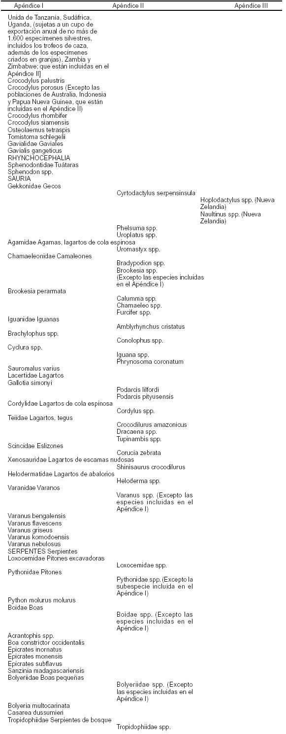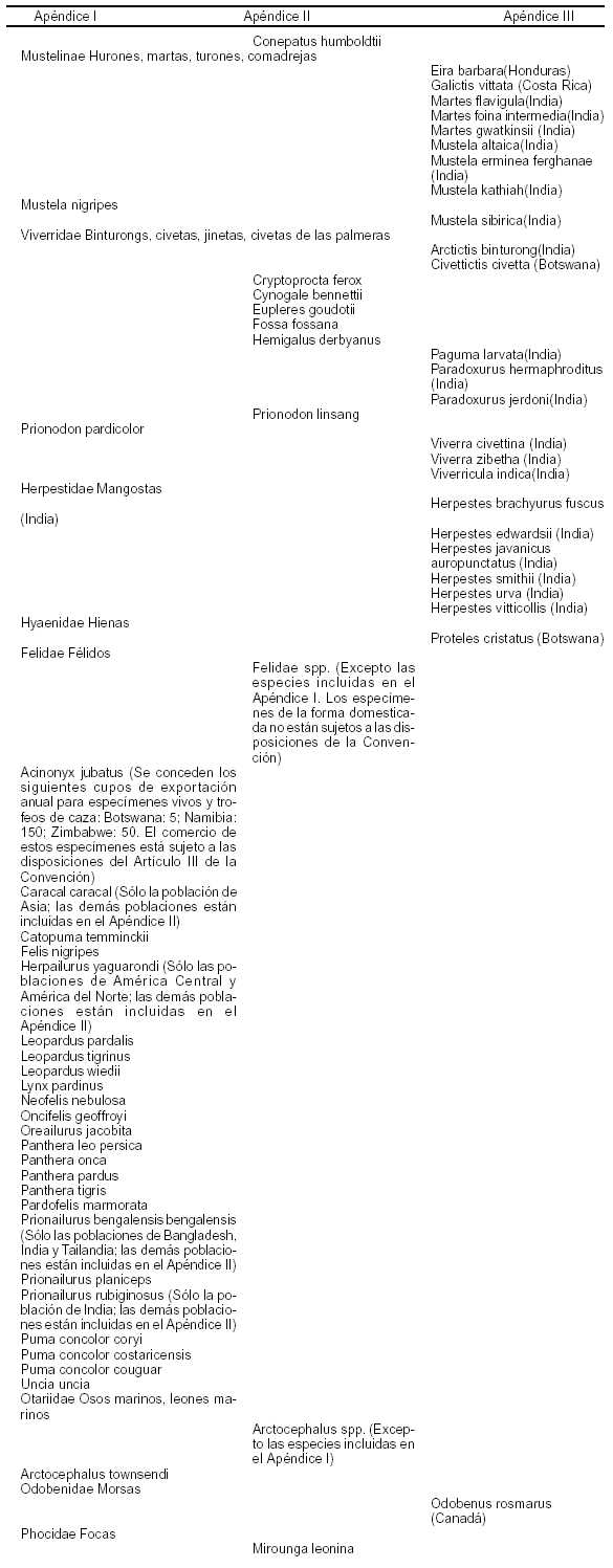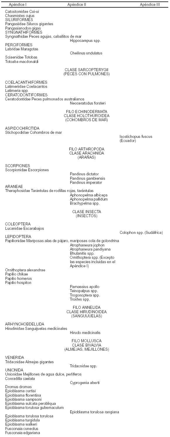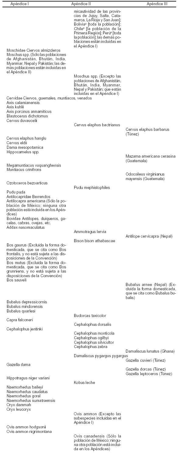 Bs. As., 1/3/2005 VISTO el expediente Nº 1-2002-5351000034/05-0 del registro de esta Secretaría de Ambiente y Desarrollo Sustentable, la Convención sobre el Comercio Internacional de Especies Amenazadas de Fauna y Flora Silvestres, aprobada por Ley Nº 22.344, su Decreto Reglamentario Nº 522 del 5 de junio de 1997, y CONSIDERANDO: Que la CONVENCION SOBRE EL COMERCIO INTERNACIONAL DE ESPECIES AMENAZADAS DE FAUNA Y FLORA SILVESTRE (CITES), a la cual la Argentina adhirió mediante la sanción de la Ley Nº 22.344, establece en su Artículo XV, (Enmiendas a los Apéndices) que en reuniones de la Conferencia de las Partes, las enmiendas adoptadas entrarán en vigor para todas las Partes noventa días después de la reunión, con la excepción de las Partes que formulen reservas. Que por el artículo 39 del Decreto Nº 522 del 5 de junio de 1997, reglamentario de, la mencionada Ley, se aprueba el listado de especies incluidas en los Apéndices I, II y III de la Convención sobre el Comercio Internacional de Especies Amenazadas de Fauna y Flora Silvestres (Ley Nº 22.344), que como Anexo I forma parte del mismo. Que con motivo de haberse llevado a cabo la Decimotercera Reunión de la Conferencia de las Partes en Bangkok, Tailandia, entre los días 2 y 14 de octubre de 2004, se han aceptado enmiendas a los Apéndices de la Convención, las cuales han entrado en vigor a partir del 12 de enero de 2005. Que el Decreto Nº 522/97, delega mediante su artículo 37 en la entonces SECRETARIA DE RECURSOS NATURALES Y DESARROLLO SUSTENTABLE de la PRESIDENCIA DE LA NACION la facultad de dictar las normas complementarias al presente decreto, así como la recepción de las Resoluciones que se aprueben en las Reuniones de la Conferencia de las Partes, y la aceptación de las modificaciones a los Apéndices, cuando el país no haya formulado reserva. Que ha tomado la intervención que le compete la DIRECCION GENERAL DE ASUNTOS JURIDICOS de la jurisdicción. Que el suscripto es competente para el dictado del presente acto en virtud de lo dispuesto por la Ley de Ministerios (T.O. por Decreto Nº 438/92, sus modificatorios y complementarios), Decreto Nº 2662 del 29 de diciembre de 1992, Decreto Nº 280 del 23 de febrero de 1995, Decreto Nº 357 de fecha 21 de febrero de 2002 y sus modificatorios; y Decreto Nº 295 de fecha 30 de junio de 2003. Por ello, EL SECRETARIO DE AMBIENTE Y DESARROLLO SUSTENTABLE RESUELVE: Artículo 1º — Apruébase el Anexo I de la presente resolución, por el cual se establecen las modificaciones a los Apéndices de la CONVENCION SOBRE EL COMERCIO INTERNACIONAL DE ESPECIES AMENAZADAS DE FAUNA Y FLORA SILVESTRE adoptadas en la Decimotercera Reunión de la Conferencia de las Partes realizada en Bangkok, Tailandia, entre los días 2 y 14 de octubre de 2004. Art. 2º — La presente resolución entrará en vigencia al día siguiente de su publicación en el Boletín Oficial. Art. 3º — Comuníquese, publíquese, dése a la Dirección Nacional del Registro Oficial y archívese. — Atilio A. Savino. ANEXO I (en vigor a partir del 12 de enero de 2005) Interpretación 1. Las especies que figuran en estos Apéndices se clasifican: a) con arreglo al nombre de las especies; o b) como si todas las especies estuviesen incluidas en un taxón superior o en una parte designada del mismo. 2. La abreviatura "spp." se utiliza para denotar todas las especies de un taxón superior. 3. Otras referencias a los taxa superiores de la especie se indican únicamente a título de información o de clasificación. Los nombres comunes que aparecen después de los nombres científicos de las familias se incluyen a título de referencia. Su finalidad es indicar la especie dentro de la familia de que se trate que está incluida en los Apéndices. En la mayoría de los casos no se trata de todas las especies de la familia. 4. Las abreviaturas siguientes se utilizan para taxa de plantas por debajo del nivel de especie: a) "spp." para denotar las subespecies; y b) "var(s)." para denotar la variedad (variedades). 5. Habida cuenta de que ninguna de las especies o taxa superiores de FLORA incluidas en el Apéndice I están anotadas, en el sentido de que sus híbridos sean tratados de conformidad con las disposiciones del Artículo III de la Convención, los híbridos reproducidos artificialmente de una o más de estas especies o taxa pueden comercializarse con un certificado de reproducción artificial, y las semillas, el polen (inclusive las polinias), las flores cortadas, los cultivos de plántulas o de tejidos obtenidos in vitro, en medios sólidos o líquidos, que se transportan en envases estériles de estos híbridos no están sujetos a las disposiciones de la Convención. 6. Los nombres de los países entre paréntesis colocados junto a los nombres de las especies incluidas en el Apéndice III son los de las Partes que solicitaron la inclusión de estas especies en ese Apéndice. 7. De conformidad con las disposiciones del párrafo b(iii) del Artículo I de la Convención, el signo (#) seguido de un número colocado junto al nombre de una especie o de un taxón superior incluido en el Apéndice II o III designa las partes o derivados provenientes de esa especie o de ese taxón y se indican como sigue a los efectos de la Convención: #1 designa todas las partes y derivados, excepto: a) las semillas, las esporas y el polen (inclusive las olinias); b) los cultivos de plántulas o de tejidos obtenidos in vitro, en medios sólidos o líquidos, que se transportan en envases estériles; y c) las flores cortadas de plantas reproducidas artificialmente; #2 designa todas las partes y derivados, excepto: a) las semillas y el polen; b) los cultivos de plántulas o de tejidos obtenidos in vitro, en medios sólidos o líquidos, que se transportan en envases estériles; c) las flores cortadas de plantas reproducidas artificialmente; y d) los derivados químicos y productos farmacéuticos acabados; #3 designa las raíces ente