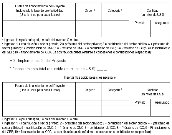 E.1 Adicionalidad financiera y en la inversión Nota: El financiamiento de las actividades de Proyecto MDL será adicional a las obligaciones financieras de las Partes incluidas en el Anexo II de la Convención en el marco de los mecanismos financieros, así como a las partidas de ayuda oficial para la asistencia al desarrollo (ODA). Explicar la adicionalidad en el contexto de este Proyecto E.1.1 Fuentes de financiamiento del Proyecto y demostración que ese financiamiento es adicional E.1.2 Estudio de factibilidad económico-financiera del Proyecto: inversión requerida, flujo de fondos, indicadores de rentabilidad, fuentes de financiamiento, etc. E.1.3 Fundamentación de la adicionalidad E.2 Desarrollo del Proyecto * Financiamiento total requerido (en miles de US $): ________ Insertar filas adicionales si es necesario