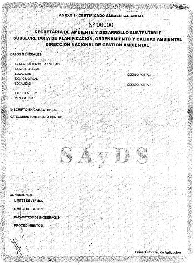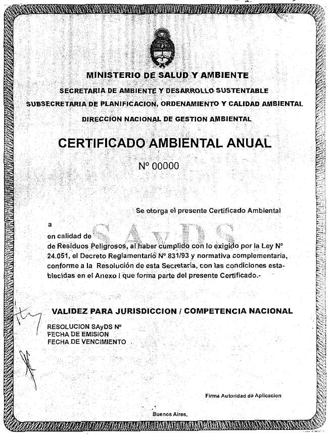Bs. As., 7/7/2005 VISTO el Expediente Nº 1-2002-5351000991/05-5 del Registro de la SECRETARIA DE AMBIENTE Y DESARROLLO SUSTENTABLE del MINISTERIO DE SALUD Y AMBIENTE, la Ley de Residuos Peligrosos Nº 24.051, su Decreto Reglamentario Nº 831 del 23 de abril de 1993, y CONSIDERANDO: Que por el expediente citado en el VISTO tramita la modificación del Modelo de Certificado Ambiental Anual. Que es deber de la Autoridad de Aplicación de la Ley dictar todas las normas complementarias que fueren menester y expedirse para la mejor interpretación y aplicación de la Ley Nº 24.051 y sus objetivos y su Decreto Reglamentario (v. art. 60, Ley Nº 24.051 y art. 60, ap. 2º, Dto. Nº 831/93). Que el artículo quinto de la ley 24.051 al referirse al Certificado Ambiental Anual lo define como el "instrumento que acredita, en forma exclusiva, la aprobación del sistema de manipulación, transporte, tratamiento o disposición final que los inscriptos aplicarán a los residuos peligrosos". Que corresponde a la Autoridad de Aplicación de la ley establecer los procedimientos internos para el otorgamiento del Certificado Ambiental Anual (conf. artículo 7 del Decreto 831/ 93), de lo cual se desprende la competencia para establecer el Modelo de Certificado Ambiental Anual. Que los Certificados Ambientales Anuales son formularios preimpresos en papel especial, con marca de agua y numerados en forma correlativa. Que ante la proximidad de agotamiento de la actual partida de Certificados corresponde ordenar una nueva impresión, la cual deberá adecuarse a los cambios institucionales y a las actuales necesidades técnicas. Que conforme lo ha establecido el artículo 33 del Decreto 831/93 corresponde que los límites de vertido y/o emisiones sean incluidos en el Certificado Ambiental Anual. Que la DIRECCION GENERAL DE ASUNTOS JURIDICOS del MINISTERIO DE SALUD Y AMBIENTE ha tomado la intervención que le compete. Que el suscripto es competente para el dictado del presente acto administrativo en virtud de lo dispuesto por la Ley Nº 24.051 y el Artículo 60 de la Ley Nº 25.612, según Decreto de Promulgación Nº 1343, de fecha 25 de julio de 2002 y Decreto Nº 923 de fecha 21 de julio de 2004.- Por ello, EL SECRETARIO DE AMBIENTE Y DESARROLLO SUSTENTABLE RESUELVE: Artículo 1º — Aprobar el Modelo de Certificado Ambiental Anual (C.A.A.), que como Anexo I forma parte integrante de la presente resolución. Art. 2º — Establecer la utilización del Modelo de Certificado Ambiental Anual (C.A.A.) aprobado en el Anexo I a partir del agotamiento de la actual partida de Certificados Ambientales Anuales. Art. 3º — Derogar toda disposición que se oponga a la presente. Art. 4º — Comuníquese, publíquese, dése a la Dirección Nacional del Registro Oficial y archívese. — Atilio A. Savino.