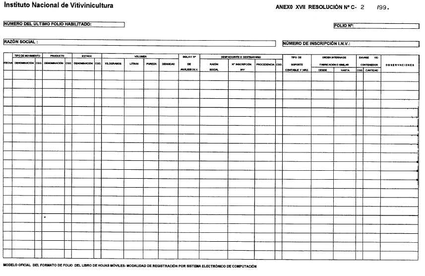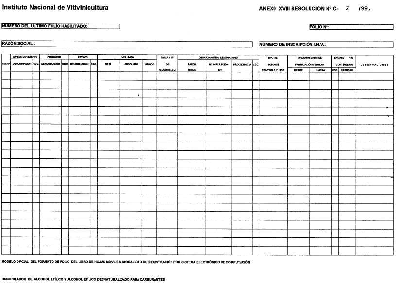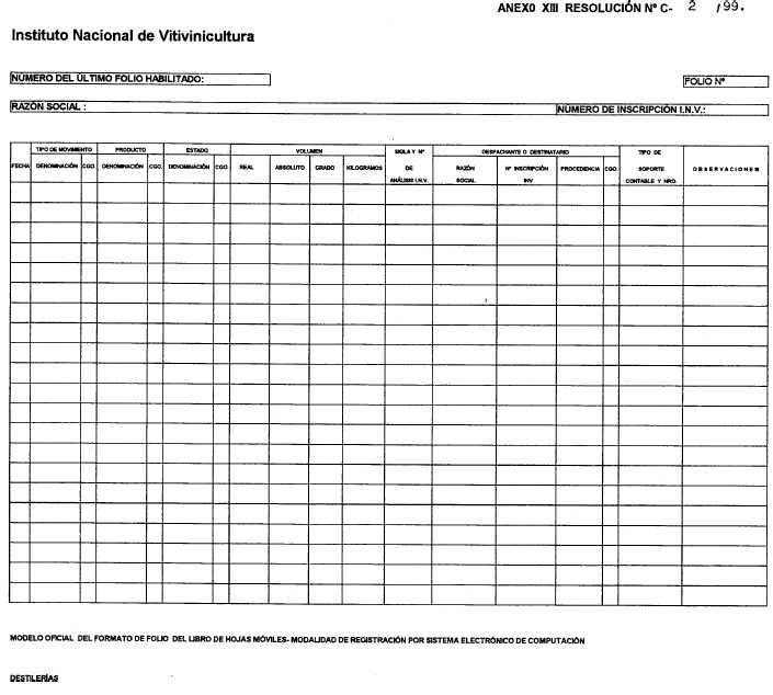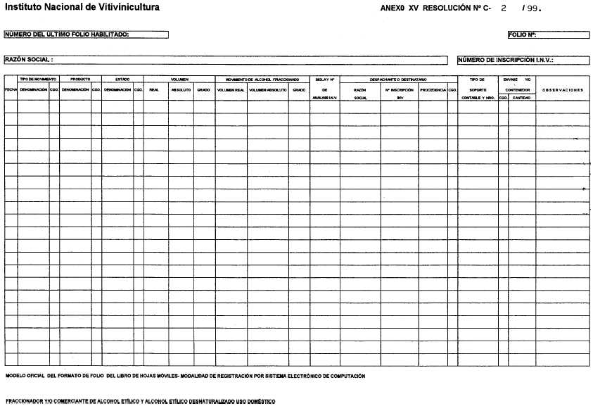 INSTRUCTIVO DE LOS ANEXOS XIII, XIV, XV, XVI, XVII, XVIII, XIX Y XX, PARA EFECTUAR LOS ASIENTOS EN EL LIBRO OFICIAL DE HOJAS MOVILES - MODALIDAD DE REGISTRACION POR SISTEMA ELECTRONICO DE COMPUTACION: La obligación de los responsables inscriptos de llevar Libros Oficiales en forma manuscrita y de presentar una Declaración Jurada Mensual, podrá cumplimentarse, en una sola entrega, en forma conjunta y a opción de aquéllos, con la presentación ante la Dependencia Jurisdiccional del Instituto Nacional de Vitivinicultura, de un listado mensual emitido por sistema electrónico de computación, habilitando ejemplares de hojas móviles correlativamente numeradas. En este Libro Oficial de Hojas Móviles habilitado por el I.N.V., deberán asentarse los movimientos de los productos según corresponda al establecimientos inscripto, sean disponibles, intervenidos, inmovilizados o decomisado, propiedad del responsable o de otras personas físicas y/o jurídicas, conforme a las pautas de llenado discriminadas en los Anexos precedentes para cada inscripto: Destilería, Fábrica de Metanol, Fraccionador y/o Comerciante de Alcohol Etílico (puro y desnaturalizado) y Metanol y Manipulador de Etanol y Metanol. 1. — CARATULA, CANTIDAD DE FOLIOS Y FORMATO FINAL DE LAS HOJAS, ENCUADERNACION, CANTIDAD DE EJEMPLARES, LUGAR Y FECHA DE PRESENTACION: 1.1. — CARATULA: La primer hoja del Libro Oficial de Hojas móviles, que no se numerará, deberá contener la siguiente leyenda: El INSTITUTO NACIONAL DE VITIVINICULTURA habilita esta hoja que será la cabeza del libro Nro. … (…) de hojas móviles llevado por sistema electrónico de computación y correspondiente al Movimiento de Entradas y Salidas de (1) ……, perteneciente a la firma… inscripta ante el I.N.V. como (2)… con el Nro.…, ubicada en la Localidad de …, Departamento o Partido de …, Provincia de … Lugar y fecha… (1) Indicar el tipo de producto que se trate, alcohol etílico (puro y desnaturalizado), aguardiente natural, materia prima y metanol, según corresponda. (2) Indicar el tipo de establecimiento (destilería, fábrica de metanol, fraccionador y/o comerciante de alcohol etílico puro, desnaturalizado y metanol y manipuladores de etílico y metanol, según corresponda). FIRMA Y SELLO DEL RESPONSABLE DEL I.N.V. 1.2. — CANTIDAD DE FOLIOS Y FORMATO FINAL DE LAS HOJAS: Por razones de operatividad, el Libro Oficial de Hojas Móviles de cada uno de los establecimientos indicados, deberá contener como MAXIMO APROXIMADAMENTE CIEN (100) hojas, impresas en anverso únicamente, siguiendo el modelo oficial de diseño, las que se encuadernarán con posterioridad. Completadas las CIEN (100) hojas móviles, o la última que se habilite en el supuesto que el listado mensual supere el número de folios indicado, el Inscripto deberá presentar una nueva carátula (punto 1.1. precedente) y comenzar otro libro de hojas móviles, con los mismos fines y destinos. El formato final del libro Oficial de Hojas Móviles, cualquiera sea su orientación, deberá contener como "MAXIMO" TRESCIENTOS CINCUENTA Y CINCO MILIMETROS (355 mm) de ancho, por TRESCIENTOS CINCO MILIMETROS (305 mm) de alto; y como "MINIMO" DOSCIENTOS DIEZ MILIMETROS (210 mm) de ancho, por DOSCIENTOS NOVENTA Y SIETE MILIMETROS (297 mm) de alto. 1.3. — CANTIDAD DE EJEMPLARES, LUGAR Y FECHA DE PRESENTACION DE LOS LISTADOS: El listado nombrado, que tendrá carácter de Declaración Jurada, reemplazará "AL LIBRO OFICIAL DE MOVIMIENTOS DE ENTRADAS Y SALIDAS DE PRODUCTOS", aprobado por la presente y "A LA DECLARACION JURADA MENSUAL", instrumentada por la Resolución Nº C-011/96. Deberá presentarse mensualmente por duplicado, en la Dependencia del I.N.V. Jurisdiccional al inscripto, en el plazo establecido para las Declaraciones Juradas, de hasta OCHO (8) días corridos posteriores al mes que se declara. 1.4. — HABILITACION Y DESTINO DE LOS EJEMPLARES DEL LIBRO DE HOJAS MOVILES: Recibidas las hojas móviles, el I.N.V. habilitará cada folio con sello foliador de la Dependencia e inicial del responsable de la misma, y les dará a los ejemplares el siguiente destino: ORIGINAL: Será devuelto al inscripto perfectamente conformado, pasando a formar parte de un libro oficial de hojas móviles correlativamente numeradas. DUPLICADO: Para la Dependencia jurisdiccional del I.N.V. Esta copia servirá de Declaración Jurada Mensual, la que será archivada una vez procesada en el sistema informático de la Dependencia. 2. — FORMA DE LLENADO: 2.1. — NUMERO DEL ULTIMO FOLIO HABILITADO: La primer hoja del listado mensual que se presente, deberá contener en el costado superior izquierdo, el número del último folio habilitado, éste deberá ser concordante con el último folio declarado y servirá para que la Dependencia receptora, efectúe el primer control. 2.2. — FOLIO NUMERO: Deberá tener de acuerdo a lo especificado precedentemente, la numeración de los folios que les corresponda mensualmente, preimpresa, comenzando el libro con la hoja Nro. UNO (1) y finalizando aproximadamente con la CIEN (100). 2.3. — RAZON SOCIAL: Por revestir carácter de Declaración Jurada, en cada hoja móvil deberá asentarse la razón social del establecimiento, atento al certificado de inscripción otorgado por I.N.V. 2.4. — NUMERO DE INSCRIPCION I.N.V.: Por igual concepto, en cada una de las hojas móviles, se deberá registrar el número de inscripción del establecimiento, conforme al certificado de inscripción otorgado por el I.N.V. 2.5. — FECHA: Se deberá indicar día, mes y año, en que se produce el movimiento, según el producto que se trate. 2.6. — TIPO DE MOVIMIENTO: De acuerdo al producto, señalar la denominación y el código del movimiento según la Tabla de Códigos de Movimientos. Ejemplo: Ingreso por Traslado, código 237, siguiendo las pautas establecidas en los anexos precedentes para cada establecimiento inscripto en particular (asientos diarios y semanales). 2.7. — PRODUCT