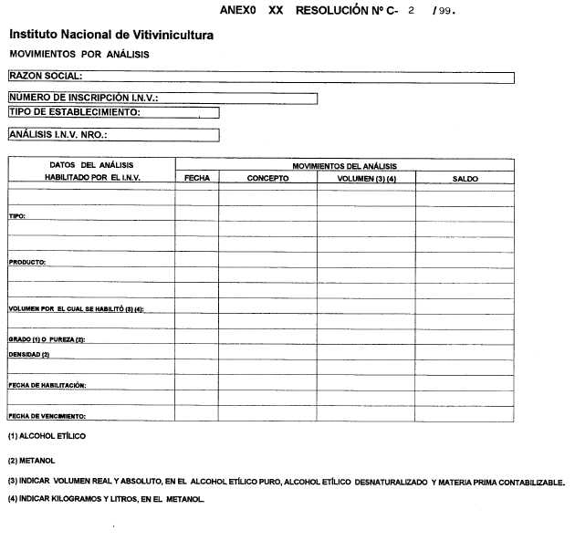 INSTRUCTIVO PARA EFECTUAR LOS ASIENTOS EN EL LIBRO OFICIAL DE MOVIMIENTOS DE ENTRADAS Y SALIDAS DE METANOL —MANIPULADOR DE METANOL— En este libro habilitado por el I.N.V., se asentarán en forma manuscrita los movimientos de los volúmenes de metanol, ingresados fraccionados en envases menores como botellas, bidones, tambores, etc. o a granel en contenedores, tanques, sean disponibles, intervenidos, inmovilizados o decomisados, propiedad del responsable o de otras personas físicas y/o jurídicas. FORMA DE LLENADO: 1. — FOLIO NUMERO: Deberá contener la numeración de los folios u hojas preimpresa. 2. — FECHA: Se deberá indicar día, mes y año, en que se produce el movimiento. 3. — MOVIMIENTO: Atento a la Tabla de Códigos de Movimientos, indicar la denominación únicamente. Ejemplo: Ingreso por traslado. 4. — METANOL: Se deberá asentar como producto metanol, dejando habilitadas columnas en blanco, para posibles intervenciones o decomisos a efectuar por parte del I.N.V., en estos casos, a continuación del tipo de producto, se indicará su estado (Ej.: metanol intervenido). 5. — VOLUMEN: En el Libro Oficial del MANIPULADOR DE METANOL, los guarismos a consignar deberán expresarse en kilogramos y litros debiendo indicar además, la pureza y densidad del metanol determinada a partir de la temperatura y mediante el empleo de la tabla VII de Densidad de Metanol (Anexo II Resolución INV C- 65/98). Para poder determinar el volumen en litros y la masa en kilogramos, se aplicará la ecuación general D= M/V (D= Densidad; M= Masa y V= Volumen), en donde V= M/ D y M= V x D. En esta columna se asentarán los volúmenes de alcohol ingresados y el de los movimientos internos, conforme al siguiente detalle: a) Diariamente y en la fecha en que ellos se hayan realizado, los relacionados a las entradas de alcohol a granel (traslados, importaciones, etc.) y b) Diariamente y a opción del interesado semanalmente, en un solo asiento, las "salidas efectivizadas para inversión o transformación o mezcla con otros productos". En todos los casos los volúmenes consignados, deberán ir precedidos del signo de suma o de resta, según el tipo de movimiento (+ en los ingresos; – en los egresos). 6. — SIGLA Y NUMERO DE ANALISIS I.N.V.: En los movimientos operados en el Libro Oficial de volúmenes de alcoholes ingresados a granel o fraccionados, ya sea por traslados, importaciones o salidas por inversión, se deberá indicar la sigla y el número correspondiente al análisis de Libre Circulación Tipo, de Importación o el de Control en el caso de intervenciones, otorgados por el I.N.V. y que amparan el alcohol. Ej. M700.000. 7. — RAZON SOCIAL: Deberá asentarse la razón social del establecimiento despachante del cual proviene el producto ingresado, conforme al certificado de inscripción otorgado por el I.N.V. En el caso de importaciones, se indicará la razón social atento la documentación comercial o aduanera que avale tal circunstancia. 8. — NUMERO DE INSCRIPCION I.N.V.: Se deberá asentar el número de inscripción del establecimiento despachante del cual proviene el producto ingresado, atento al certificado de inscripción otorgado por el I.N.V. En el caso de importaciones, no se indicará tal concepto, en su lugar se asentará el nombre del país remitente del alcohol. 9. — TIPO DE SOPORTE CONTABLE Y NUMERO: Se asentará el tipo y número del soporte contable (factura, remito, etc.) que amparó el desplazamiento del producto desde el remitente. Para el caso de factura se indicará la letra "F", para el remito se utilizará la letra "R", para una guía interna la letra "G", etc., y en todos los casos, seguido por el número correspondiente a que se hace referencia. 10. — NUMERO DE ORDEN INTERNA DE FABRICACION O SIMILAR: El establecimiento que cuente con este tipo de documento o similar, indicará el número de la orden interna de fabricación o similar, correspondiente a la salida del alcohol para su inversión o mezcla con otros productos, pudiendo indicarse un solo volumen diario y a opción del inscripto, semanal, y por consiguiente la numeración interna de fabricación o similar, será correlativa desde/hasta. 11. — ENVASE Y/O CONTENEDOR: El Instituto Nacional de Vitivinicultura ha normado que los manipuladores de metanol, deben inscribirse en los registros de éste, cualquiera sea su volumen a manipular e ingresados a granel o fraccionados en envases menores. En consecuencia en esta columna y de acuerdo a la Tabla de Códigos de Capacidad Según Tipo de Envase de Fraccionamiento y Códigos de Contenedores a Granel, se indicará la denominación y la cantidad de cada uno de los envases (bidones, tambores, botellas de diferentes capacidades, perfectamente identificados mediante rotulación, como asimismo, camiones, acoplados, semirremolques, tanques, etc.), contenedores de los alcoholes efectivamente ingresados en concepto de compra, traslados e importaciones, procedentes de un destilador y de un fraccionador y/o comerciante, inscriptos en el Instituto Nacional de Vitivinicultura o desde un tenedor (almacén mayorista, supermercado mayorista, droguería, importador, etc.) no inscripto en el Organismo. 12. — OBSERVACIONES: Columna destinada para asentar cualquier dato de interés. INSTRUCTIVO PARA EFECTUAR LOS ASIENTOS EN EL LIBRO OFICIAL DE MOVIMIENTOS DE ENTRADAS Y SALIDAS DE ALCOHOL ETILICO DESNATURALIZADO PARA CARBURANTES —MANIPULADOR DE ALCOHOL ETILICO DESNATURALIZADO PARA CARBURANTES— En este libro habilitado por el I.N.V., se asentarán en forma manuscrita los movimientos de los volúmenes de alcohol etílico desnaturalizado para carburantes ingresados a granel en contenedores tanque, sean disponibles, intervenidos, inmovilizados o decomisados, propiedad del responsable o de otras personas físicas y/o jurídicas. FORMA DE LLENADO: 1. — FOLIO NUMERO: Deberá contener la numeración de los folios u hojas preimpresa. 2. — FECHA: Se deberá indicar día, mes