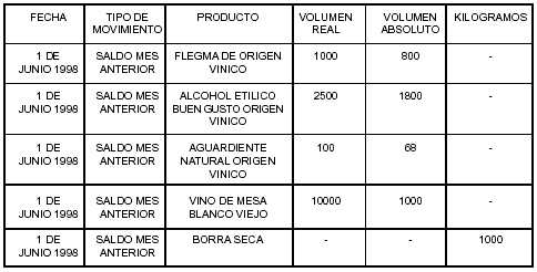 Cumplimentado el paso anterior, se procederá a registrar los movimientos del mes. 3.1.2. — PARA EL MES SIGUIENTE POR PRODUCTO: Al final de cada mes y antes de estampar la leyenda tipo (punto 4 siguiente), se deberá indicar en columna producto y por tipo de producto el "SALDO PARA EL MES SIGUIENTE", registrando en cada una de las columnas correspondientes a los productos, los siguientes guarismos: volumen real y absoluto para el alcohol etílico puro y desnaturalizado, aguardiente natural, flegma, etc.; kilogramos y litros para el metanol, y kilogramos para la materia prima no contabilizable. Ejemplo:
