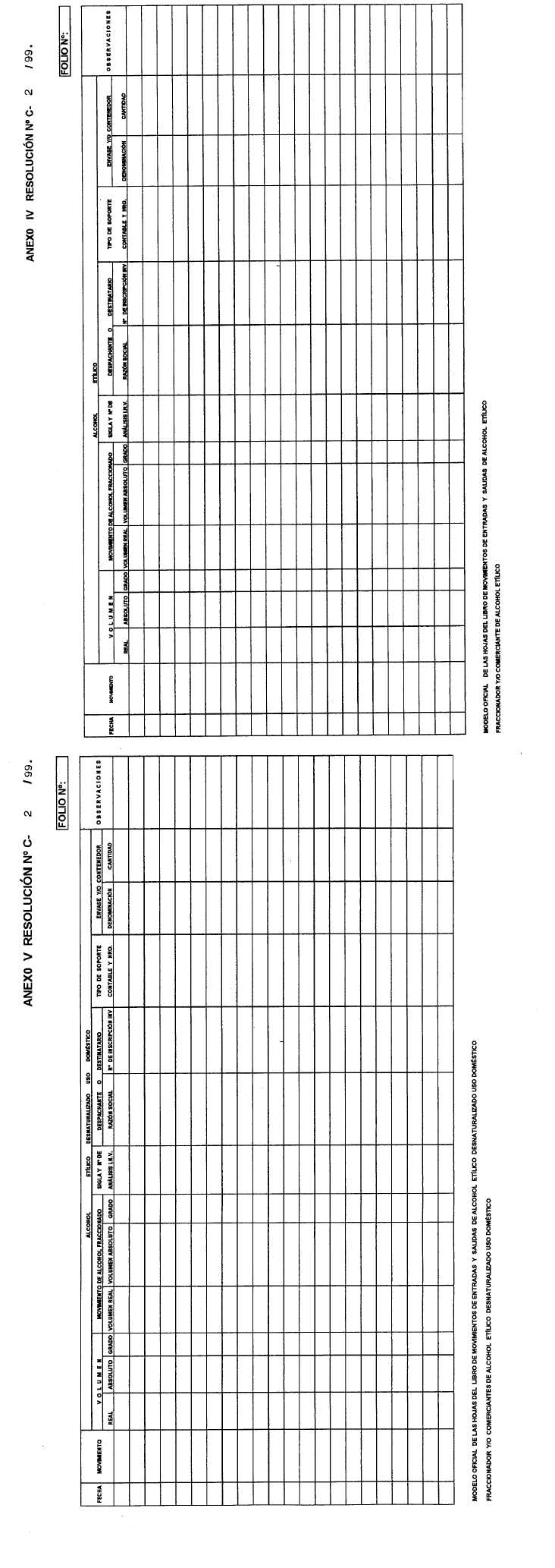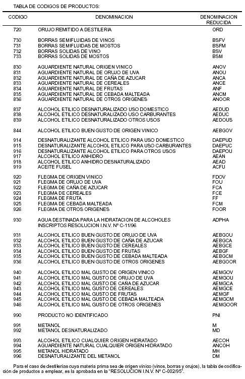 Bs. As., 12/2/99 VISTO el Expediente Nº 189-000262/97-3 del registro de este Organismo, la Ley Nacional de Alcoholes Nº 24.566, las Resoluciones Nros. C-002/95, C-011/96, C-003/97, C-37/97, C-57/98, C- 58/98, C-62/98, C-63/98 y C-65/98, y CONSIDERANDO: Que el Artículo 4º de la mencionada Ley establece que el Instituto Nacional de Vitivinicultura será la autoridad de aplicación y dictará las normas reglamentarias necesarias para la prosecución de los fines inherentes a la misma. Que el Título I, Capítulo VII, de la Resolución Nº C-011/96, establece la obligatoriedad de los inscriptos de llevar Libros Oficiales habilitados por el Instituto Nacional de Vitivinicultura. Que es necesario contar con elementos indispensables destinados a volcar los movimientos de entradas y salidas producidos en la manipulación de alcohol etílico, aguardiente natural, metanol y de corresponder, materia prima contabilizable. Que la registración de los citados movimientos, puede efectuarse por sistemas electrónicos de computación, utilizando la misma información que la de los Libros Oficiales que sustituye, habilitando ejemplares de hojas móviles correlativamente numeradas por los inscriptos. Por ello, y en uso de las facultades conferidas por las Leyes Nros. 14.878 y 24.566, el Decreto- Ley Nº 2284/91 y los Decretos Nros. 1084/96 y 1286/98, EL DIRECTOR NACIONAL DEL INSTITUTO NACIONAL DE VITIVINICULTURA RESUELVE: Artículo 1º — Apruébanse los Modelos Oficiales de Hojas de Libros de Movimientos de Entradas y Salidas de Alcohol y Materia Prima Origen Vínico para: destilería, fábrica, fraccionador y/o comerciante y manipulador y las normas a las que deberán atenerse los responsables inscriptos para efectuar las registraciones en los mismos, que como Anexos I al IX, forman parte de la presente Resolución. Art. 2º — Apruébanse las Tablas de Códigos de productos; de Movimientos de Productos y de Capacidad Según Tipo de Envases de Fraccionamiento y Códigos de Capacidad de Contenedores Tanques a Granel (camiones, acoplados, semirremolques y vagones tanque), que como Anexos X al XII, forman parte de la presente Resolución. Art. 3º — Cuando personal de fiscalización del Organismo practique inventario general, y el mismo se encuentre dentro de la tolerancia reglamentaria establecida, el inscripto deberá proceder a ajustar los saldos del Libro Oficial de Movimientos, a la existencia real constatada, ingresando o egresando en forma proporcional a cada producto, las diferencias de volúmenes según corresponda. Art. 4º — Si de la existencia real constatada se encontraran diferencias en más fuera de la tolerancia del MEDIO POR CIENTO (0,5%), el inscripto procederá a ingresar el volumen de excedente intervenido, a una columna habilitada para tal fin en el libro Oficial de Movimientos de Entradas y Salidas, como "PRODUCTO INTERVENIDO POR EXCEDENTE DE INVENTARIO". Asimismo, adecuará los saldos del libro a la existencia real comprobada incluida la tolerancia en más permitida. Art. 5º — Si el inventario se encuentra fuera de la tolerancia reglamentaria en menos, el responsable, deberá proceder a ajustar los saldos del Libro Oficial de Movimientos, a la existencia real constatada, egresando en forma proporcional a cada producto, las diferencias de volúmenes en menos, según corresponda. Art. 6º — La obligación de los responsables inscriptos de llevar en forma manuscrita Libro Oficial de Movimientos, como asimismo proporcionar al INSTITUTO NACIONAL DE VITIVINICULTURA una Declaración Jurada Mensual de los mismos, podrá cumplimentarse con la sola presentación de un listado mensual emitido por sistema electrónico de computación, habilitando ejemplares de hojas móviles correlativamente numeradas, pasando a formar parte del Libro Oficial de Hojas Móviles-Modalidad de Registración por Sistema Electrónico de Computación. Apruébanse las normas para ejecutar los mismos y que integran la presente Resolución como Anexos XIII al XX. Art. 7º — Los listados detallados en el punto precedente, y una vez consensuada la adaptación entre los sistemas electrónicos de computación del Instituto Nacional de Vitivinicultura y los de las empresas, deberán ir acompañados por un soporte magnético (disco flexible o disquete), cuyo diseño y normas para su desarrollo, serán oportunamente indicados. Art. 8º — Los inscriptos según corresponda a su tipo de establecimiento, que opten por el Libro Oficial de Hojas Móviles-Modalidad de Registración por Sistema Electrónico de Computación instrumentado precedentemente, quedan eximidos de llevar en forma manuscrita el Libro Oficial de Movimientos de Entradas y Salidas de Alcohol y Materia Prima Origen Vínico citado en punto 1º, y de presentar la Declaración Jurada Mensual descripta en la Resolución Nº C-011/96, según el establecimiento que se trate, atento que dicha hoja móvil cumplirá funciones de tal. Art. 9º — Otórgase un plazo máximo de TREINTA (30) días corridos a partir de la publicación de la presente Resolución, para que los responsables inscriptos, implementen las normas establecidas en puntos anteriores. Art. 10. — Cualquier declaración inexacta acto de omisión, serán considerados en infracción al Artículo 29, inc. f) de la Ley Nº 24.566 y los responsables se harán pasibles de las sanciones establecidas por el Artículo 30 de la citada Ley. Art. 11. — Derógase del Anexo a la Resolución Nº C-003/97, el Punto 1.2. in fine y el segundo párrafo del Punto 1.3.b. Art. 12. — Regístrese, comuníquese, publíquese, dése a la Dirección Nacional del Registro Oficial para su publicación, notifíquese y cumplido, archívese. — Félix R. Aguinaga. ANEXO I RESOLUCION Nº C. 2/99 NORMAS GENERALES PARA EL LLENADO DEL LIBRO OFICIAL DE MOVIMIENTOS DE ENTRADAS Y SALIDAS DE VOLUMENES DE ALCOHOL ETILICO, AGUARDIENTE NATURAL, MATERIA PRIMA DE ORIGEN VINICO Y METANOL, SEGUN EL ESTABLECIMIENTO QUE SE TRATE: ENCU