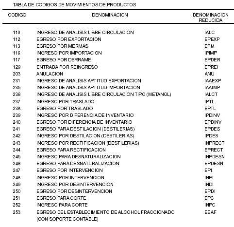INSTRUCTIVO DEL ANEXO XI PARA EL USO DE LA TABLA DE MOVIMIENTOS DE PRODUCTOS, SEGUN DENOMINACION DEL MOVIMIENTO 110 - INGRESO DE ANALISIS LIBRE CIRCULACION: Para declarar en el Libro Oficial, los movimientos de ingreso del volumen de alcohol etílico, aguardiente natural y materia prima contabilizable, analizados por libre circulación. La fecha de este movimiento a registrar, deberá ser y coincidir con la del sello fechador estampado en el certificado analítico habilitado por el Instituto Nacional de Vitivinicultura. 112 - EGRESO POR EXPORTACION: Para indicar las salidas producidas por exportación, que deben ser concordantes con los volúmenes consignados en la comunicación diaria correspondiente. 113 - EGRESO POR MERMAS: Para descargar las mermas resultantes del estudio de inventario practicado por el Organismo. 116 - INGRESO POR IMPORTACION: Para indicar las entradas producidas por importación. 117 - EGRESO POR DERRAME: Se utilizará para indicar únicamente los derrames accidentales y los autorizados referidos a los productos "no alcohólicos" existentes dentro de los establecimientos industrializadores de alcoholes. 129 - ENTRADA POR REINGRESO: Para denunciar los ingresos de productos despachados, ya sea a granel o fraccionados y con cargo a una determinada documentación oficial (remito, factura, guía, trámite, sumario, expediente, etc.). 203 - ANULACION: Para declarar en el Libro Oficial, los movimientos mal asentados. En el caso de que los libros se lleven por sistemas electrónicos de computación, si la cifra se ha registrado de más, se indicará con un signo negativo para deducirlo; si se ha consignado en menos, se indicará con un signo positivo para sumarla, los signos que correspondan se indicarán precediendo la correspondiente cifra volumétrica. 231 — INGRESO DE ANALISIS APTITUD EXPORTACION: Para declarar en el Libro Oficial, los movimientos de ingreso del volumen de alcohol etílico, aguardiente natural y metanol, según corresponda, analizados por aptitud de exportación. La fecha de este movimiento a registrar, deberá ser y coincidir con la del sello fechador estampado en el certificado analítico habilitado por el Instituto Nacional de Vitivinicultura. 235 — INGRESO DE ANALISIS APTITUD IMPORTACION: Para declarar en el Libro Oficial, los movimientos de ingreso del volumen de alcohol etílico, aguardiente natural y metanol, según corresponda, analizados por aptitud importación. La fecha de este movimiento a registrar, deberá ser y coincidir con la del sello fechador estampado en el certificado analítico habilitado por el Instituto Nacional de Vitivinicultura. 236 — INGRESO DE ANALISIS LIBRE CIRCULACION TIPO (METANOL): Para declarar en el Libro Oficial, los movimientos de ingreso del volumen de metanol analizados por libre circulación tipo. La fecha de este movimiento a registrar, deberá ser y coincidir con la del sello fechador estampado en el certificado analítico habilitado por el Instituto Nacional de Vitivinicultura. 237 — INGRESO POR TRASLADO: Para indicar los ingresos a granel (contenedores tanque) de alcoholes provenientes de otros inscriptos ante el I.N.V. Como asimismo para asentar las materias primas y los desnaturalizantes ingresados. 238 — EGRESO POR TRASLADO: Para indicar los egresos a granel (contenedores tanque) de alcoholes, como asimismo para asentar las materias primas egresadas a otros inscriptos ante el I.N.V., como por ejemplo otra destilería, y cuyos volúmenes deben ser concordantes con los consignados en la comunicación diaria correspondiente. 239 — INGRESO POR DIFERENCIA DE INVENTARIO: Para denunciar movimiento producidos por diferencias en inventarios practicados por personal del I.N.V. y por indicación de éstos en forma actuada. 240 — EGRESO POR DIFERENCIA DE INVENTARIO: Para denunciar movimientos producidos por diferencias en inventarios practicados por personal del I.N.V. y por indicación de éstos en forma actuada. 241 — EGRESO PARA DESTILACION (DESTILERIAS): Para indicar la salida de materia prima para su destilación. 242 — INGRESO POR ESTILACION (DESTILERIAS): Para indicar los ingresos de alcoholes producidos por el proceso de destilación. 243 — INGRESO POR RECTIFICACION (DESTILERIAS): Para indicar el ingreso de flegmas u otros alcoholes rectificados. 244 — EGRESO PARA RECTIFICACION: Para indicar los egresos de productos con destino a tal operación. 245 — INGRESO PARA DESNATURALIZACION: Para indicar el agregado del "infestante" y sustancias testigos en la desnaturalización de alcoholes para uso doméstico, carburantes, otros. 246 — EGRESO PARA DESNATURALIZACION: Para indicar la salida del acohol para la obtención de alcoholes desnaturalizados de diferentes tipos. 247 — EGRESO POR INTERVENCION: Para indicar las salidas de productos por intervenciones oficiales de productos. 248 — INGRESO POR INTERVENCION: Para indicar los ingresos de productos intervenidos al habilitar la columna correspondiente por intervenciones oficiales de productos. 249 — INGRESO POR DESINTERVENCION: Para indicar los ingresos de productos desintervenidos por el Instituto Nacional de Vitivinicultura. 250 — EGRESO POR DESINTERVENCION: Para indicar los egresos de productos por desintervenciones oficiales producidas. 251 — EGRESO PARA CORTE: Para denunciar movimientos producidos en los libros respecto a cortes con otros alcoholes. 252 — INGRESO PARA CORTE: Para denunciar movimientos producidos en los libros respecto a cortes con otros alcoholes. 253 — EGRESO DEL ESTABLECIMIENTO DE ALCOHOL FRACCIONADO (CON SOPORTE CONTABLE): Para denunciar las salidas de planta de los productos fraccionados, egresos que deben estar amparados por soportes contables (remito, guía, factura). 254 — AUMENTO DE VOLUMEN POR INHABILITACION (AGREGADO DE AGUA): Para denunciar los ingresos de hidratante (agua) para disminuir el contenido alcohólico. 255 — EGRESO PARA INVERSION: Para indicar la mezcla de alcohol etílico y/o meta
