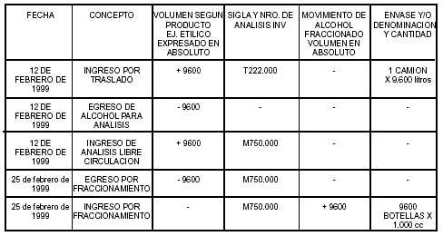 INSTRUCTIVO PARA EFECTUAR LOS ASIENTOS EN EL LIBRO OFICIAL DE MOVIMIENTOS DE ENTRADAS Y SALIDAS DE ALCOHOL ETILICO —FRACCIONADOR Y/O COMERCIANTE DE ALCOHOL ETILICO— En este libro habilitado por el I.N.V., se asentarán en forma manuscrita los movimientos de volúmenes de alcohol etílico tanto a granel como fraccionados, disponibles, intervenidos, inmovilizados o decomisados, propiedad del responsable o de otras personas físicas y/o jurídicas. FORMA DE LLENADO: 1. — FOLIO NUMERO: Deberá contener la numeración de los folios u hojas preimpresa. 2. — FECHA: Se deberá indicar día, mes y año, en que se produce el movimiento. 3. — MOVIMIENTO: Atento a la Tabla de Códigos de Movimientos, indicar la denominación únicamente. Ejemplo: Ingreso por traslado. 4. — ALCOHOL ETILICO: Se deberá asentar como producto, alcohol etílico, dejando habilitadas columnas en blanco, para posibles intervenciones o decomisos a efectuar por parte del I.N.V., en estos casos, a continuación del tipo de producto, se indicará su estado (Ej: Alcohol buen gusto intervenido). 5. — VOLUMEN: Deberán registrarse en el LIBRO OFICIAL DEL FRACCIONADOR Y/O COMERCIANTE DE ALCOHOL ETILICO, el volumen real y absoluto, expresados a 20°C (en función del grado alcohólico internacional), debiendo señalar además, su grado alcohólico, también expresado a 20°C (grado alcohólico internacional) y en % v/v. Para determinar el grado alcohólico real, fuerza real o grado alcohólico en volumen real y el volumen absoluto, cuyos valores de observación se encuentran comprendidos entre –10°C y +40°C de temperatura (t) y entre 0,0 y 103,1% v/v de grado alcohólico (q*), se utilizarán las tablas VIIIb y XIbb, implementadas por Resolución Nº C-62/98. En esta columna se asentarán los movimientos de los volúmenes de alcohol ingresados o egresados y los efectuados internamente, de acuerdo al número de análisis y por tipo de envase (denominación y cantidad según columna), conforme al siguiente detalle: 1) Diariamente y en la fecha en que ellos se hayan realizado, los relacionados a las entradas y salidas de alcohol a granel (traslados, importaciones, exportaciones, etc.), y 2) Diariamente y a opción del inscripto semanalmente, en un solo asiento, los fraccionamientos efectuados, es decir el vuelco de envases mayores (piletas, tanques, etc.) a envases menores (botellas, bidones, tambores), utilizando el movimiento "egreso por fraccionamiento", este volumen deberá ser ingresado a la siguiente columna denominada "movimiento de alcohol fraccionado", como "ingreso por fraccionamiento". En todos los casos los volúmenes consignados, deberán ir precedidos del signo de suma o de resta, según el tipo de movimiento (+ en los ingresos; – en los egresos). 6. — MOVIMIENTO DE ALCOHOL FRACCIONADO: En el LIBRO OFICIAL DEL FRACCIONADOR Y/O COMERCIANTE DE ALCOHOL ETILICO, deberá consignarse el volumen real y absoluto, expresados a 20°C (en función del grado alcohólico internacional), debiendo señalar además, su grado alcohólico, también expresado a 20°C (grado alcohólico internacional) y en % v/v. Para determinar el grado alcohólico real, fuerza real o grado alcohólico en volumen real y el volumen absoluto, cuyos valores de observación se encuentran comprendidos entre –10°C y +40°C de temperatura (t) y entre 0,0 y 103,1% v/v de grado alcohólico (q*), se utilizarán las tablas VIIIb y XIbb, implementadas por Resolución Nº C-62/ 98. En esta columna se registrará diariamente y a opción del inscripto semanalmente, en un solo asiento de acuerdo al número de análisis y por tipo de envase (denominación y cantidad según columna), el volumen de alcohol fraccionado, conforme al siguiente detalle: a) Los fraccionamientos efectuados, utilizando en la columna correspondiente al movimiento "ingreso por fraccionamiento", egresados de la columna volumen, por fraccionamiento y b) Las salidas de volúmenes de alcoholes fraccionados en botellas, bidones, tambores, efectivizados fuera del establecimiento fraccionador, es decir el volumen comercializado en envases menores perfectamente rotulados y amparada su circulación por medio de documentación comercial, como ser factura, remito, guía, etc., conformadas, utilizando el movimiento "egreso del establecimiento de alcohol fraccionado (con soporte contable)". En todos los casos los volúmenes consignados, deberán ir precedidos del signo de suma o de resta, según el tipo de movimiento (+ en los ingresos; - en los egresos). 7. — SIGLA Y NUMERO DE ANALISIS I.N.V.: En los movimientos de los volúmenes que se asienten en el Libro Oficial del fraccionador y/o comerciante, en concepto de ingresos o egresos a granel, por traslado, importaciones, etc., salidas y/o entradas por fraccionamiento y egreso del establecimiento de alcohol fraccionado (con soporte contable), se deberá indicar la sigla y el número correspondiente al análisis otorgado por el I.N.V. que ampara al producto, Libre Circulación, Exportación, Importación o el de Control en el caso de intervenciones (Ej. M700.000). 8. — RAZON SOCIAL: Deberá asentarse la razón social del establecimiento despachante del cual proviene el producto ingresado, o del destinatario o receptor, al cual va el producto egresado, conforme al certificado de inscripción otorgado por el I.N.V. En el caso de exportaciones o importaciones, se indicará la razón social atento la documentación comercial o aduanera que avale tal circunstancia. 9. — NUMERO DE INSCRIPCION I.N.V.: Se deberá asentar el número de inscripción del establecimiento despachante del cual proviene el producto ingresado, o del destinatario o receptor al cual va el producto egresado, atento al certificado de inscripción otorgado por el I.N.V. En el caso de exportaciones o importaciones no se indicará tal concepto, en su lugar se asentará el nombre del país de destino o de origen del producto. En los casos de las salidas de alcoholes etílicos 