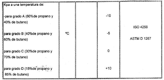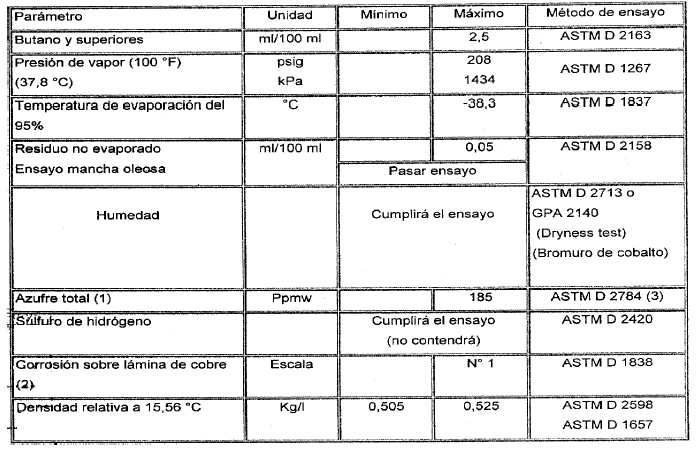 NOTAS: (1) Corresponde al producto con el odorizante incorporado. (2) La muestra no debe contener inhibidores de corrosión. (3) La aplicación del método de la norma ASTM 2784 para la determinación de azufre total, no se contrapone a que las empresas utilicen otros métodos de control de los procesos productivos, como así también comprobaciones parciales con otras metodologías para monitoreo de los mismos, no impidiendo que para las transacciones comerciales y de acuerdo entre partes, se implementen las determinaciones propuestas, con las salvedades mencionadas. ANEXO II NORMA DE ODORIZACION DEL GAS LICUADO DE PETROLEO (GLP) 1 – Odorizantes: 1.1 – El butano, propano y las mezclas de ambos serán odorizados con etil mercaptan en proporción UNO COMA DOSCIENTOS CINCUENTA KILOGRAMOS (1,250 Kg) por cada CIEN METROS CUBICOS (100 m3) de fluido al estado líquido. En el caso de Gas Licuado de Petróleo (GLP) distribuido por redes y cuando sea necesario reforzar la odorización se incorporará en fase gaseosa el odorante que resulte preciso. Para ello los operadores de distribución Gas Licuado de Petróleo (GLP) por redes deberán prever los recursos necesarios en sus plantas de almacenamiento para poder asegurar la realización de las tareas afines a este cometido. Debiendo en todos los casos coordinar con la Productora dadora del producto los pasos necesarios para el logro del cometido. 1.2 – Para el caso de utilizarse otro odorante en reemplazo al establecido en 1.1 del presente anexo, la Productora, Petroquímica o Procesadora deberá realizar los ensayos comparativos necesarios en laboratorios independientes de reconocida trayectoria en el mercado local, cuyo protocolo e informe técnico se elevará a la SUBSECRETARIA DE COMBUSTIBLES a través de una Empresa Auditora de Seguridad (EAS) habilitada por la SECRETARIA DE ENERGIA quien de corresponder autorizará su empleo. 1.3 – La cantidad de odorante utilizado permitirá detectar la presencia del gas olorizado en una mezcla con aire, a una concentración de UNA SOBRE VEINTICINCO (1/25) del límite explosivo inferior. 2 – Equipos 2.1 – El Gas Licuado de Petróleo (GLP) será odorizado con equipos a inyección, pudiendo ser bombas dosificadoras directamente en la fase líquida. 2.2 - Los equipos y sistemas de odorización a utilizar deberán ser certificados por una Empresa Auditora de Seguridad habilitada por la SECRETARIA DE ENERGIA. 3 – Control: 3.1 – Los protocolos de ensayo de odorización cumplirán y formarán parte de la información requerida por artículos 6º, 7º y 8º del cuerpo principal de la presente resolución. 3.2 – Los controles de odorimetría del Gas Licuado de Petróleo (GLP) se efectuarán con odómetros portátiles o por el método de la cámara de ensayo (Room Test) los valores en cada caso serán los siguientes:
