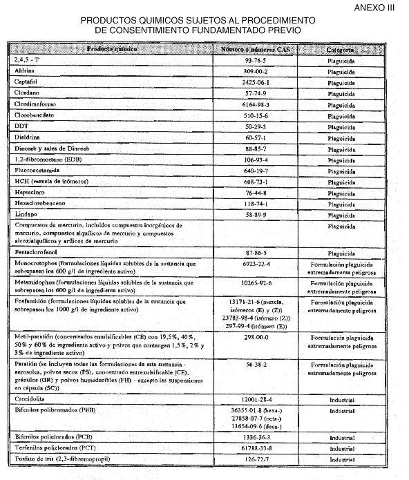 A los efectos del presente Convenio: a) Por "producto químico" se entiende toda sustancia, sola o en forma de mezcla o preparación, ya sea fabricada u obtenida de la naturaleza, excluidos los organismos vivos. Ello comprende las siguientes categorías: plaguicida, (incluidas las formulaciones plaguicidas extremadamente peligrosas) y producto químico industrial; b) Por "producto químico prohibido" se entiende aquél cuyos usos dentro de una o más categorías han sido prohibidos en su totalidad, en virtud de una medida reglamentaria firme, con objeto de proteger la salud humana o el medio ambiente. Ello incluye los productos químicos cuya aprobación para primer uso haya sido denegada o que las industrias hayan retirado del mercado interior o de ulterior consideración en el proceso de aprobación nacional cuando haya pruebas claras de que esa medida se haya adoptado con objeto de proteger la salud humana o el medio ambiente; c) Por "producto químico rigurosamente restringido" se entiende todo aquel cuyos usos dentro de una o más categorías hayan sido prohibidos prácticamente en su totalidad, en virtud de una medida reglamentaria firme, con objeto de proteger la salud humana o el medio ambiente, pero del que se sigan autorizando algunos usos específicos. Ello incluye los productos químicos cuya aprobación para prácticamente cualquier uso haya sido denegada o que las industrias hayan retirado del mercado interior o de ulterior consideración en el proceso de aprobación nacional cuando haya pruebas claras de que esa medida se haya adoptado con objeto de proteger la salud humana o el medio ambiente; d) Por "formulación plaguicida extremadamente peligrosa" se entiende todo producto químico formulado para su uso como plaguicida que produzca efectos graves para la salud o el medio ambiente observables en un período de tiempo corto tras exposición simple o múltiple, en sus condiciones de uso; e) Por "medida reglamentaria firme" se entiende toda medida para prohibir o restringir rigurosamente un producto químico adoptada por una Parte que no requiera la adopción de ulteriores medidas reglamentarias por esa Parte; f) Por "exportación" e "importación"’, en sus acepciones respectivas, se entiende el movimiento de un producto químico de una Parte a otra Parte, excluidas las operaciones de mero tránsito; g) Por "Parte" se entiende un Estado u organización de integración económica regional que haya consentido en someterse a las obligaciones establecidas en el presente Convenio y en los que el Convenio esté en vigor; h) Por "organización de integración económica regional", se entiende una organización constituida por Estados soberanos de una región determinada a la que sus Estados miembros hayan transferido competencias en asuntos regulados por el presente Convenio y que haya sido debidamente facultada, de conformidad con sus procedimientos internos, para firmar, ratificar, aceptar o aprobar el Convenio o adherirse a él; i) Por "Comité de Examen de Productos Químicos" se entiende el órgano subsidiario a que se hace referencia en el párrafo 6 del artículo 18. Artículo 3 Ambito de aplicación del Convenio 1. El presente Convenio se aplicará a: a) Los productos químicos prohibidos o rigurosamente restringidos; y b) Las formulaciones plaguicidas extremadamente peligrosas 2. El presente Convenio no se aplicará a: a) Los estupefacientes y las sustancias sicótropicas; b) Los materiales radiactivos; c) Los desechos; d) Las armas químicas; e) Los productos farmacéuticos, incluidos los medicamentos humanos y veterinarios; f) productos químicos utilizados como aditivos alimentarios; g) Los alimentos; h) Los productos químicos en cantidades que sea improbable afecten a la salud humana o el medio ambiente, siempre que se importen: i) Con fines de investigación o análisis; o ii) Por un particular para su uso personal en cantidades razonables para ese uso. Artículo 4 Autoridades nacionales designadas 1. Cada Parte designará una o más autoridades nacionales que estarán facultadas para actuar en su nombre en el desempeño de las funciones administrativas requeridas en virtud del presente Convenio. 2. Cada Parte procurará que esas autoridades cuenten con recursos eficientes para desempeñar eficazmente su labor. 3. Cada Parte, a más tardar en la fecha de entrada en vigor del presente Convenio para ella, comunicará a la Secretaría el nombre y la dirección de esas autoridades. Comunicará asimismo de inmediato a la Secretaría cualquier cambio que se produzca posteriormente en el nombre o la dirección de esas autoridades. 4. La Secretaría comunicará de inmediato a las Partes las notificaciones que reciba con arreglo a lo dispuesto en el párrafo 3. Artículo 5 Procedimientos relativos a los productos químicos prohibidos o rigurosamente restringidos 1. Cada Parte que haya adoptado una medida reglamentaria firme lo comunicará por escrito a la Secretaría. Esa comunicación se hará lo antes posible, pero a más tardar en un plazo de noventa días a partir de la fecha en que la medida reglamentaria firme haya entrado en vigor, e incluirá, de ser posible, la información estipulada en el anexo I. 2. Cada Parte, en la fecha de entrada en vigor del presente Convenio para ella, comunicará por escrito a la Secretaría las medidas reglamentarias firmes que haya adoptado y estén en vigor en ese momento, con la salvedad de que las Partes, que hayan presentado notificaciones de medidas reglamentarias firmes en virtud de las Directrices de Londres en su forma enmendada o del Código Internacional de Conducta no tendrán que presentarlas de nuevo. 3. La Secretaría verificará, tan pronto como sea posible, pero a más tardar en un plazo de seis meses a partir de la recepción de una notificación en virtud de Los párrafos 1 y 2, si la notificación contiene la información estipulada en el anexo I. Si la notificación contiene la información requerida, la Secretarí