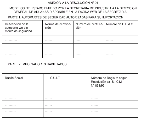 A LA DIRECCION NACIONAL DE INDUSTRIA NN en su carácter de (titular de la empresa, representante legal y/o apoderado), constituyendo domicilio especial en ....................... me dirijo a esa Dirección Nacional, a efectos de solicitar la emisión del Certificado de Homologación de Autoparte y/o Elemento de Seguridad para el Mercado de Reposición, para la comercialización del siguiente producto (definición/marca/modelo), que bajo juramento declaro reúne idénticas características técnicas a las del producto que posee el número de C.H.A.S. más abajo consignado, En cumplimiento de los recaudos legales exigibles, manifiesto con carácter de declaración jurada: 1. Que me encuentro inscripto/a en el Registro al que se refiere el ANEXO I numeral 4 de la Resolución N° 838/99, 2. Que el número de registro que me ha sido otorgado por la D.N.I. es ................................, 3. Que el C.H.A.S. otorgado a la Autoparte y/o elemento de seguridad a importar/fabricar se identifica ..............................., 4. Que el Certificado N° ....................... otorgado por (consignar el organismo certificador reconocido), cuenta/no cuenta con fecha de caducidad. (De contar con fecha de caducidad se deberá consignar la misma y asumir el compromiso de presentar la correspondiente reválida ante la DIRECCION NACIONAL DE INDUSTRIA). 5. Que asumo por este medio el compromiso de someterme a los controles que pueda realizar la DNI, mediante la designación de un organismo certificador por ella designado, para que en caso que existan sospechas de que no se cumple con los estándares de calidad requeridos o frente a indicios de adulteraciones, se tomen muestras en depósito y/o en el mercado y se compruebe que se continúa cumpliendo con las condiciones establecidas en los certificados emitidos por Organismos Certificadores reconocidos por las Naciones Unidas conforme TRANS/WP 29/343. Asimismo se autoriza por este medio a ....................... DNI/LE/CI ............... a realizar las tramitaciones vinculadas a la emisión del C.H.A.S., así como al retiro del respectivo certificado. Atentamente. FIRMA ................... ANEXO III A LA RESOLUCION N° 91 PROCEDIMIENTO PARA LA EMISION DEL CERTIFICADO DE HOMOLOGACION DE AUTOPARTES Y/O ELEMENTOS DE SEGURIDAD (C.H.A.S.) PARA EL MERCADO DE REPOSICION QUE NO CUENTEN CON HOMOLOGACION DE LOS ORGANISMOS CERTIFICADORES RECONOCIDOS POR LAS NACIONES UNIDAS CONFORME TRANS/WP 29/343 Para la emisión del Certificado de Homologación de la Autopartes y/o elementos de seguridad (C.H.A.S.), la DIRECCION NACIONAL DE INDUSTRIA deberá adoptar alguno de los siguientes procedimientos, según corresponda: I. Autopartes y/o elementos de seguridad a comercializar, que no cuenten con un C.H.A.S., otorgado por la DIRECCION NACIONAL DE INDUSTRIA (DNI). En estos casos, la DNI deberá constatar como condición necesaria para la emisión del C.H.A.S, que se haya presentado la documentación que a continuación se consigna, firmada por el representante legal consignado en el Registro a que se refiere el ANEXO I numeral 4 de la Resolución N° 838/99: 1. Nota en la cual manifieste con carácter de declaración jurada: a) que se encuentra inscripto en el Registro al que se refiere el ANEXO I numeral 4 de la Resolución N° 838/99, b) que el número de registro otorgado por la DNI es............., c) que asume el compromiso de someterse a los controles que pueda realizar la DNI, mediante la designación de un organismo certificador por ella designado, para que en caso que existan sospechas de que no se cumple con los estándares de calidad requeridos o frente a indicios de adulteraciones, se tomen muestras en depósito y/o en el mercado, y se compruebe que se continúa cumpliendo con las condiciones establecidas en la licencia de certificación. 2. Copia autenticada de la Licencia de Certificación, otorgada por ... (consignar el nombre del organismo de certificación reconocido de acuerdo con lo establecido en el inciso a) y c) del artículo 8° de la presente Resolución), bajo las condiciones indicadas en la norma IRAM 354 que es equivalente a la Guía ISO/IEC 28 (Modelo N° 5) y conforme a la norma IRAM del producto que resulte aplicable en cada caso en particular. En el caso de que exista un centro tecnológico que acredite, ante un Organismo de Certificación Reconocido según los incisos a) y c) del artículo 8°, tener un contrato de asistencia técnica con una planta de fabricación que posea certificación por tercera parte bajo normas ISO 9001, equivalentes o superiores, se tomará como válida la certificación de producto según norma IRAM 354 que es equivalente a la Guía ISO/IEC 28 (Modelo N° 5) en el centro tecnológico. II. Autopartes y/o elementos de seguridad a comercializar, que ya cuenten con un C.H.A.S., otorgado por la DIRECCION NACIONAL DE INDUSTRIA (DNI): En estos casos, la DNI deberá constatar como condición necesaria para la emisión del C.H.A.S, que se haya presentado la siguiente documentación firmada por el representante legal consignado en el Registro a que se refiere el ANEXO I numeral 4 de la Resolución N° 838/99. 1. Que el requirente haya declarado bajo juramento que el producto a importar y/o comercializar reúne idénticas características técnicas al producto que posee el número de C.H.A.S. más abajo consignado. 2. Nota en la cual manifieste con carácter de declaración jurada: a) Que se encuentra inscripto en el Registro al que se refiere el ANEXO I numeral 4 de la Resolución N° 838/99, b) Que el número de registro otorgado por la DNI es................, c) Que la identificación del número de C.H.A.S. otorgado a la Autoparte y/o elemento de seguridad de que se trate es ...... d) Que asume el compromiso de someterse a los controles que pueda realizar la DNI, mediante la designación de un organismo certificador por ella designado, para que en caso que existan sospechas de que no se cumple con los estándares de calidad