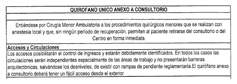 Art. 4° — Establécese que los quirófanos anexos a consultorios deberán cumplimentar los requerimientos definidos en el ANEXO I y sólo podrán realizar Cirugía Menor Ambulatoria. Entendiéndose por Cirugía Menor Ambulatoria a la descripta en el Artículo 2°.