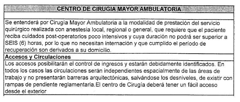 Art. 6° — Establécese que los quirófanos de los Centros Médicos que realicen Cirugía Mayor Ambulatoria deberán cumplimentar los requisitos establecidos en el ANEXO III de la presente. Entendiéndose por Cirugía Mayor Ambulatoria a la descripta en el Artículo 3°.