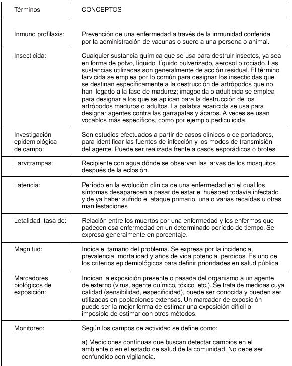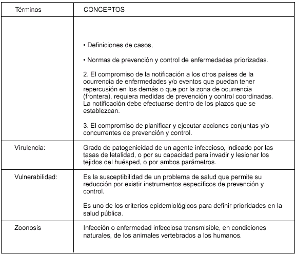 Bs. As., 20/11/2001 VISTO: el Tratado de Asunción, el Protocolo de Ouro Preto y la Resolución Grupo Mercado Común del Mercosur N° 53/99, y CONSIDERANDO: Que por la citada Resolución GMC se resolvió aprobar el documento "Glosario de Terminología de Vigilancia Epidemiológica-Mercosur". Que de los considerandos de la referida Resolución surge que es necesario contar con una terminología armonizada en el área de Vigilancia Epidemiológica con vistas a posibilitar la formación de un Sistema de Informaciones sobre la materia. Que la Resolución fue previamente discutida y armonizada con la participación de representantes de la República Argentina, y fue recomendada al Grupo Mercado Común por la Comisión de Vigilancia Epidemiológica y Control Sanitario de Puertos, Aeropuertos, Terminales y Pasos Fronterizos y la Comisión de Coordinadores Nacionales del SGT N° 11-Salud del Mercosur. Que en virtud del Artículo 38 del Protocolo de Ouro Preto signado por nuestro país, nace el compromiso de adoptar las medidas necesarias para asegurar el cumplimiento de las normas emanadas de los órganos del Mercosur y en consecuencia deben incorporarse las Resoluciones GMC/MERCOSUR a la normativa jurídica nacional. Que la Dirección de Asuntos Jurídicos ha tomado la intervención de su competencia. Por ello; EL MINISTRO DE SALUD RESUELVE: Art. 1° — Aprobar el documento "Glosario de Terminología de Vigilancia Epidemiológica-Mercosur" que figura como Anexo I, que forma parte integrante de la presente resolución, en el cual se transcribe literalmente la versión en castellano de la Resolución GMC N° 53/99 el que queda incorporado a la normativa jurídica nacional vigente. Art. 2° — Regístrese, comuníquese. Dése a la Dirección Nacional del Registro Oficial para su publicación. Cumplido, archívese PERMANENTE. — Héctor J. Lombardo. MERCOSUR/GMC/RES. N° 53/99 GLOSARIO DE TERMINOLOGIA DE VIGILANCIA EPIDEMIOLOGICA MERCOSUR VISTO: El Tratado de Asunción, el Protocolo de Ouro Preto, las Resoluciones N° 91/93 y 16/96 del Grupo Mercado Común y la Recomendación N° 13/98 del SGT N° 11 "Salud". CONSIDERANDO: La conveniencia de contar con una terminología armonizada en el área de vigilancia epidemiológica con vistas a posibilitar la formación de un Sistema de Informaciones sobre la materia. EL GRUPO MERCADO COMUN RESUELVE: Art. 1° — Aprobar el Glosario de Terminología de Vigilancia Epidemiológica - MERCOSUR, en sus versiones en español y portugués, que consta como Anexo y forma parte de la presente Resolución. Art. 2° — Los Estados Partes pondrán en vigencia las disposiciones legislativas, reglamentarias y administrativas necesarias, para dar cumplimiento a la presente Resolución, a través de los siguientes organismos: Argentina: Ministerio de Salud Brasil: Ministério da Saúde Paraguay: Ministerio de Salud Pública y Bienestar Social Uruguay: Ministerio de Salud Pública Art. 3° — Los Estados Partes del MERCOSUR deberán incorporar la presente Resolución a sus ordenamientos jurídicos nacionales antes del 29/XI/99. XXXV GMC - Montevideo, 29/IX/99 GLOSARIO DE TERMINOLOGIA DE VIGILANCIA EPIDEMIOLOGICA — MERCOSUR —