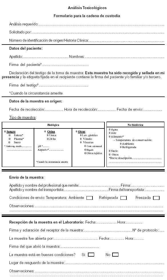 ANEXO I. Introducción ANEXO II. Obtención de muestra y cadena de custodia ANEXO III. Guía para la obtención, transporte, conservación y análisis de muestras en pacientes con probable intoxicación aguda ANEXO IV. Guía para la obtención, transporte, conservación y análisis de muestras en pacientes con probable intoxicación crónica ANEXO V. Guía para la obtención, transporte, conservación y análisis de muestras en pacientes con probable intoxicación por alimentos ANEXO VI. Laboratorios de Análisis Toxicológicos de la República Argentina