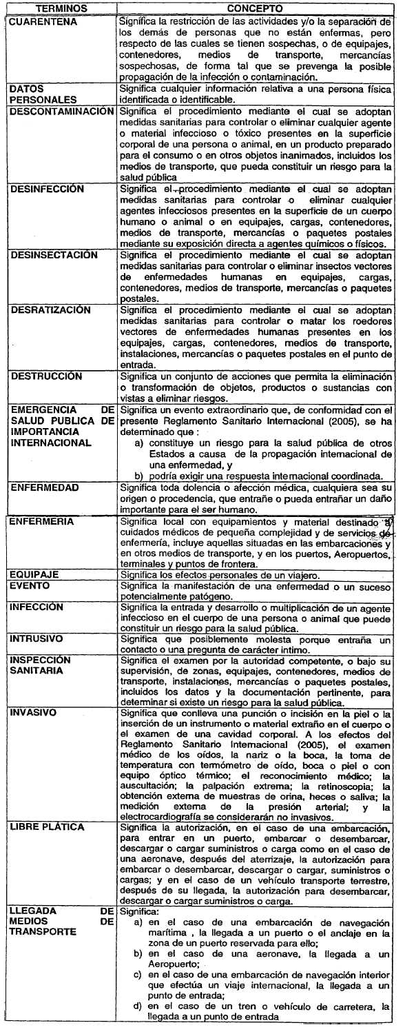Bs. As., 6/12/2006 VISTO Expediente Nº 1-2002-8.787/06-0 del registro del ex-MINISTERIO DE SALUD Y AMBIENTE, el Tratado de Asunción del 26 de marzo de 1991, aprobado por la Ley Nº 23.981 y el Protocolo de Ouro Preto del 17 de diciembre de 1994, aprobado por la Ley Nº 24.560 y la Resolución Nº 91/93 del Grupo Mercado Común, y CONSIDERANDO: Que el proceso de integración del Mercosur es de la mayor importancia estratégica para la REPUBLICA ARGENTINA. Que, conforme a los artículos 2º, 9º, 15, 20, 38, 40 y 42 del Protocolo de Ouro Preto, las normas Mercosur aprobadas por el Consejo del Mercado Común, el Grupo Mercado Común y la Comisión de Comercio del Mercosur, son obligatorias y deben ser incorporadas, cuando ello sea necesario, al ordenamiento jurídico nacional de los Estados Partes mediante los procedimientos previstos en su legislación. Que conforme a los artículos 3º, 14 y 15 de la Decisión 20/02 del Consejo del Mercado Común, las normas Mercosur que no requieran ser incorporadas por vía aprobación legislativa podrán ser incorporadas por vía administrativa por medio de actos del Poder Ejecutivo. Que el artículo 7º de la citada Decisión establece que las normas Mercosur deberán ser incorporadas a los ordenamientos jurídicos de los Estados Partes en su texto integral. Que la DIRECCION GENERAL DE ASUNTOS JURIDICOS, ha tomado la intervención que le compete. Que el presente se dicta en ejercicio de las atribuciones conferidas en función de lo dispuesto en el artículo 23 ter inciso 54) de la Ley de Ministerios, Texto Ordenado Decreto Nº 438/92. Por ello, EL MINISTRO DE SALUD RESUELVE: Artículo 1º — Incorpórase al ordenamiento jurídico nacional la Resolución GRUPO MERCADO COMUN Nº 34/05 "GLOSARIO DE CONTROL SANITARIO DE PUERTOS, AEROPUERTOS, TERMINALES Y PUNTOS DE FRONTERA (DEROGACION DE LA RESOLUCION GMC Nº 27/00)" que se adjunta como anexo y forma parte integrante de la presente Resolución. Art. 2º — En los términos del Protocolo de Ouro Preto, la norma que se incorpora por la presente Resolución, entrará en vigor simultáneamente en los Estados Partes, TREINTA (30) días después de la fecha de comunicación efectuada por la Secretaría del Mercosur informando que todos los Estados han incorporado la norma a sus respectivos ordenamientos jurídicos internos. La entrada en vigor simultánea de la Resolución GRUPO MERCADO COMUN Nº 34/05 "GLOSARIO DE CONTROL SANITARIO DE PUERTOS, AEROPUERTOS, TERMINALES Y PUNTOS DE FRONTERA (DEROGACION DE LA RESOLUCION GMC Nº 27/00)" será comunicada a través de UN (1) aviso en el Boletín Oficial de la Nación (cfr. Artículo 40 inciso iii del Protocolo de Ouro Preto). Art. 3º — Comuníquese, publíquese, dése a la Dirección Nacional del Registro Oficial y archívese. — Ginés M. González García. MERCOSUR/GMC/RES. Nº 34/05 GLOSARIO DE CONTROL SANITARIO DE PUERTOS, AEROPUERTOS, TERMINALES Y PUNTOS DE FRONTERA (DEROGACION DE LA RESOLUCION GMC Nº 27/00) VISTO: El Tratado de Asunción, el Protocolo de Ouro Preto y la Resolución Nº 22/05 del Grupo Mercado Común. CONSIDERANDO: Que la Resolución de la 58a Asamblea Mundial de la Salud, WHA 58.3 del 23 de mayo de 2005, adopta el nuevo Reglamento Sanitario Internacional (2005). Que es conveniente compatibilizar los términos que integran el glosario del Reglamento Sanitario Internacional (2005) con los de la Subcomisión de Puertos, Aeropuertos, Terminales y Puntos de Frontera del SGT Nº 11 "Salud". EL GRUPO MERCADO COMUN RESUELVE: Art. 1 — Aprobar el "Glosario de Control Sanitario de Puertos, Aeropuertos, Terminales y Puntos de Frontera", que consta como Anexo y forma parte de la presente Resolución. Art. 2 — Los Organismos Nacionales competentes para la implementación de la presente Resolución son: Argentina: Ministerio de Salud y Ambiente Brasil: Ministério da Saúde Paraguay: Ministerio de Salud Pública y Bienestar Social Uruguay: Ministerio de Salud Pública Art. 3 — Derógase la Resolución GMC Nº 27/00. Art. 4 — Los Estados Partes deberán incorporar la presente Resolución a sus ordenamientos jurídicos nacionales antes del 19/IV/2006. LX GMC - Montevideo, 19/X/05 ANEXO GLOSARIO DE CONTROL SANITARIO DE PUERTOS, AEROPUERTOS, TERMINALES Y PUNTOS DE FRONTERA