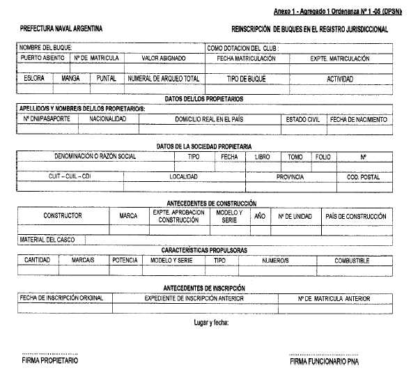 Bs. As., 10/1/2005 VISTO lo sugerido por la Dirección de Policía de Seguridad de la Navegación, y CONSIDERANDO: Que el artículo 1º del Decreto 282-96 faculta a la Prefectura Naval Argentina a disponer la reinscripción de los buques y artefactos navales de la Matrícula Nacional y a determinar las modalidades a que habrá de someterse. Que el Registro de la Matrícula Nacional (Registros Jurisdiccionales) se encuentra desactualizado en razón de que la última reinscripción data del año 1973, encontrándose inscriptas embarcaciones inexistentes. Que el relevamiento periódico de la Matrícula Nacional debe efectuarse mediante la realización de un censo a cargo de esta Institución. Por ello; EL PREFECTO NACIONAL NAVAL DISPONE: Artículo 1° — Procédase a la realización de un censo con el objeto de efectuar la reinscripción de los buques, artefactos navales y acuáticos pertenecientes a los Registros Jurisdiccionales de la Matrícula Nacional. La obligación censal estará a cargo de propietarios o poseedores de las unidades indicadas, sin que ello implique regularización dominial alguna. Art. 2° — Fíjese, por razones operativas y a fin de poder efectuar la reinscripción a través de las Dependencias Jurisdiccionales de la Prefectura Naval Argentina, como plazo máximo de realización del trámite censal el de ciento ochenta (180) días a partir de la fecha de entrada en vigor de esta Ordenanza. Vencido ese lapso las embarcaciones que no hubieren cumplido con la obligación censal, quedarán automáticamente interdictas para navegar. El trámite será realizado por ante la Dependencia Jurisdiccional en que se encuentra matriculada la embarcación. Por razones debidamente justificadas podrá en su defecto efectuar el trámite censal ante cualquier Registro Jurisdiccional. Art. 3° — Asígnese, por el Sistema Integrado de Buques (SIB), a los buques, artefactos navales y artefactos acuáticos reinscriptos y a los que se inscriban durante el cumplimiento de la obligación censal, un nuevo número de Matrícula en orden correlativo, consistente en el Código Alfabético de Destino correspondiente a la Dependencia Jurisdiccional seguido de un número, sin espacio, que irá precedido del numeral cero (0) a efectos de distinguirlos del antes utilizado. Art 4° — Quedan automáticamente eliminados de la Matrícula Nacional llevada por los Registros Jurisdiccionales los buques, artefactos navales y/o artefactos acuáticos cuyos propietarios o poseedores no hubieren dado cumplimiento a la obligación prescripta en el Art. 1°, una vez transcurrido el plazo de DOS (2) años contados a partir del comienzo de la obligación censal. Art. 5° — Exceptúese de cumplir con la obligación censal a los propietarios que tramiten la inscripción de buques, artefactos navales y/o artefactos acuáticos con posterioridad a la fecha de iniciación del censo. Esta excepción incluye los trámites de inscripción iniciados y aún no concluidos. Art. 6° — La presente Ordenanza entrará en vigor a partir del 1º de marzo del año 2005. Art. 7° — Apruébanse las Normas para la realización del trámite censal (Agregado Nº 1), la Planilla Censal (Anexo Nº 1 al Agregado Nº 1) y Matrícula Provisoria (Anexo Nº 2 al Agregado Nº 1), que integran esta Ordenanza. Art. 8° — Por la DIRECCION DE PLANEAMIENTO, procédase a su impresión, distribución, publicación incluyéndola en el Boletín Informativo de la Marina Mercante y el Boletín Oficial; y difusión en el Sitio Oficial en INTERNET como Ordenanza (DPSN) incorporándose al TOMO 2 "REGIMEN ADMINISTRATIVO DEL BUQUE". Posteriormente, corresponderá su archivo en el organismo propiciante. — Carlos Edgardo Fernández. — Ricardo Rodríguez.
