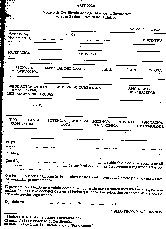 Observaciones: (*) Cualquiera de ellos deberá estar capacitado para operar equipo de comunicación VHF. (+) En embarcaciones tanques, un tripulante deberá estar capacitado para cumplir las funciones de bombero. Artículo 34. — Obligación de poseer Certificado. Quedarán obligados a poseer el Certificado de Dotación de Seguridad todas las embarcaciones de la Hidrovía cuyo arqueo sea igual o superior a veinte toneladas de arqueo bruto y las de pasajeros cualquiera sea su tonelaje. TITULO IV NORMAS RELATIVAS A LAS VIAS NAVEGABLES CAPITULO I Balizamiento y Señalización Artículo 35. — Régimen general. Los países signatarios adoptarán el sistema IALA (Región B) adaptado a la navegación fluvial o el sistema de señalización de "ACCIONES A EMPRENDER" o ambos en forma indistinta, según las características particulares de los diferentes tramos de la Hidrovía. Sobre la base de lo establecido precedentemente, los países signatarios acordarán un reglamento único de balizamiento. Artículo 36. — Responsabilidad. El balizamiento será ejecutado por las autoridades competentes responsables de la señalización náutica en el país signatario donde se localiza el tramo respectivo de la Hidrovía, debiendo posibilitar el tránsito seguro y ordenado de las embarcaciones, tanto diurno como nocturno, en forma permanente y continua. En los tramos de la Hidrovía donde más de un país signatario ejerza jurisdicción, coordinarán las medidas necesarias a tal fin. CAPITULO II Remoción de obstáculos no permanentes para la navegación Artículo 37. — Definición. Se entiende por obstáculos no permanentes para la navegación a las embarcaciones o bienes hundidos, sumergidos, encallados y perdidos o arrojados en aguas de la Hidrovía, los cuales quedan sometidos a las disposiciones vigentes del país signatario en cuya jurisdicción se encuentre el obstáculo. Artículo 38. — Ejecución de las operaciones. El responsable por los obstáculos no permanentes para la navegación podrá solicitar a la autoridad competente del país signatario respectivo, autorización para investigarlos, removerlos, extraerlos o demolerlos, en todo o en parte. Dicha autoridad podrá vetar el uso de medios o de procedimientos que, a su entender, representen riesgos inaceptables para la seguridad de la navegación, de terceros o del medio ambiente. Antes de dar inicio a la investigación, exploración, remoción, extracción o demolición solicitadas o determinadas de los obstáculos no permanentes a la navegación, la autoridad competente citada determinará que el responsable adopte las acciones inmediatas y preliminares para la seguridad de la navegación, de terceros y del medio ambiente. Artículo 39. — Responsabilidad de los países signatarios. El país signatario en cuyas aguas jurisdiccionales se encuentren los obstáculos será responsable de la coordinación, el control y la fiscalización de las operaciones y actividades de investigación, de exploración, remoción, extracción y demolición de los mismos. La autoridad competente de dicho país signatario, podrá intimar al responsable por los obstáculos no permanentes para la navegación, su remoción, extracción o demolición, en todo o en parte, cuando constituyan o vayan a constituir peligro, obstáculo para la navegación o amenaza de daños a terceros o al medio ambiente. La citada autoridad establecerá plazos para el comienzo y término de la remoción, extracción o demolición, los que podrán ser prorrogados. La autoridad competente del país signatario en cuyas aguas se encuentren los obstáculos no permanentes para la navegación, podrá asumir las operaciones de investigación, exploración, remoción, extracción o demolición de los mismos, por cuenta y riesgo de su responsable, si éste no hubiere dispuesto o podido realizar esas operaciones dentro de los plazos establecidos. TITULO V NORMAS DE SEGURIDAD RELATIVAS A LA NAVEGACION PROPIAMENTE DICHA CAPITULO I Asistencia y Salvamento de Embarcaciones y Bienes Artículo 40. — Definición. Se entiende por operaciones de asistencia o salvamento de embarcaciones y bienes a todo acto o actividad emprendida para dar asistencia o salvamento a una embarcación, aeronave o cualesquiera otros bienes que se encuentren en peligro en el ámbito de la Hidrovía. Artículo 41. — Ejecución de las Operaciones. Las operaciones de asistencia o salvamento serán ejecutadas por los responsables de las embarcaciones en peligro. En caso de que ellas no se realicen en los plazos y condiciones legales del país signatario en cuya jurisdicción haya ocurrido el hecho y pueda originar riesgos para la seguridad de la navegación o de contaminación para el medio ambiente; la autoridad competente de dicho país asumirá la operación de salvamento o asistencia respectiva. Al solo efecto de este artículo, en aquellos tramos de la Hidrovía en donde más de un país signatario ejerza jurisdicción, se establece para el canal principal el siguiente régimen: a) En el caso de que la embarcación auxiliada enarbole el pabellón de alguno de los países signatarios costeros en dicho tramo, las operaciones de asistencia o salvamento serán prestadas por el país del pabellón de la embarcación, pudiendo el otro país realizar las operaciones si aquél no se encontrare en condiciones de ejecutarlas. b) Las operaciones de asistencia o salvamento a embarcaciones, de terceras banderas que naveguen aguas arriba, serán de responsabilidad del país signatario que se encuentre sobre la margen izquierda del río, y si la embarcación navegara aguas abajo lo será el país signatario que se encuentre ubicado sobre la margen derecha del río. Las operaciones indicadas en los incisos precedentes no excluirán la intervención de embarcaciones privadas o públicas de cualquier bandera que pudieran prestar el servicio de asistencia o salvamento, sin perjuicio de que las autoridades jurisdiccionales ejerzan la fisca