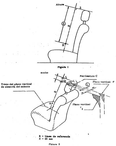 2.4.2. Zona de impacto. 2.4.2.1. La zona de impacto esta limitada lateralmente por DOS (2) planos verticales longitudinales, uno a cada lado y distante SETENTA MILIMETROS (70 mm) del plano de simetría del asiento considerado. 2.4.2.2. La zona de impacto estará limitada en su altura inferior, por un plano perpendicular a la línea de referencia R situado a SEISCIENTOS TREINTA Y CINCO MILIMETROS (635 mm) del punto H. 2. 4. 3. Las partes de las caras delanteras y traseras del cabezal que estén ubicadas hacia afuera de los planos longitudinales verticales estarán acolchados de tal forma que prevengan todo contacto directo de la cabeza con los componentes de la estructura, la cual tendrá en dichas zonas un radio de curvatura mayor que CINCO MILIMETROS (5 mm). 2.4.4. Anclaje: Ninguna parte rígida o peligrosa se proyectará fuera del acolchado del cabezal, desde el anclaje o del interior del respaldo del asiento como resultado de la presión ejercida por la cabeza durante el ensayo. 2.4.4.1. El anclaje no permitirá, sin una acción voluntaria por parte del usuario, modificar la altura prescripta para su uso.