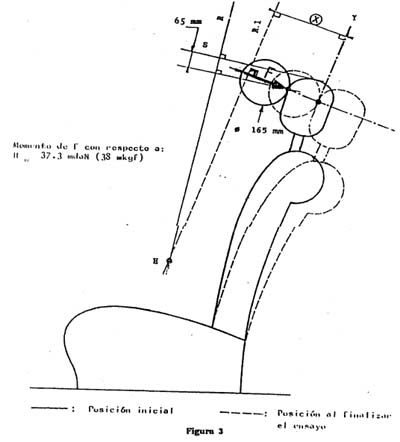 2.7.5.3.3. Se determina la línea de referencia desplazada R', aplicando a la parte que simula el respaldo en el maniquí una fuerza inicial que produzca un momento hacia atrás de TREINTA Y SIETE CON TRES DECIMAS DE METRO DECANEWTON (37,3 m.daN) alrededor del punto H.