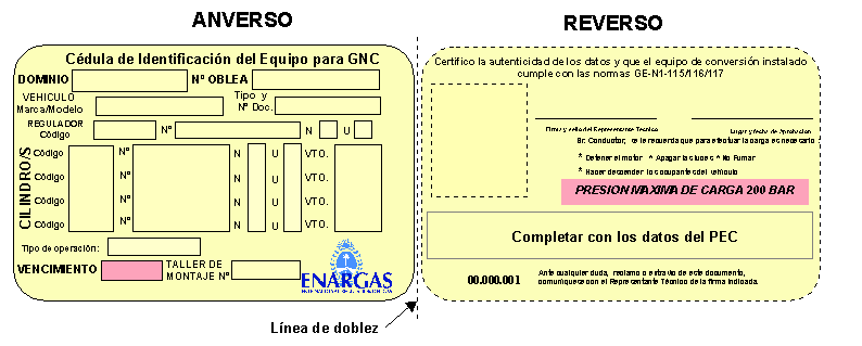 - Color: El fondo será de color amarillo; letras negras; y resaltado en rojo el espacio para "Vencimiento" y el fondo de "PRESION MAXIMA DE CARGA 200 BAR". - La cédula contará con elementos de seguridad para evitar fraudes o uso indebido. - El PEC deberá completar la información en cada uno de los campos, no admitiéndose tachaduras o enmiendas. - A los efectos de la posterior utilización del campo recuadrado con líneas punteadas, las tarjetas que sean completadas durante el año 2003, el PEC deberá resguardarlas dentro de un sobre plástico transparente para evitar su desgaste, y a partir de 2004 las suministrará plastificadas. - El modelo es el que se indica a continuación y será proporcionada a los PEC por el ENARGAS.